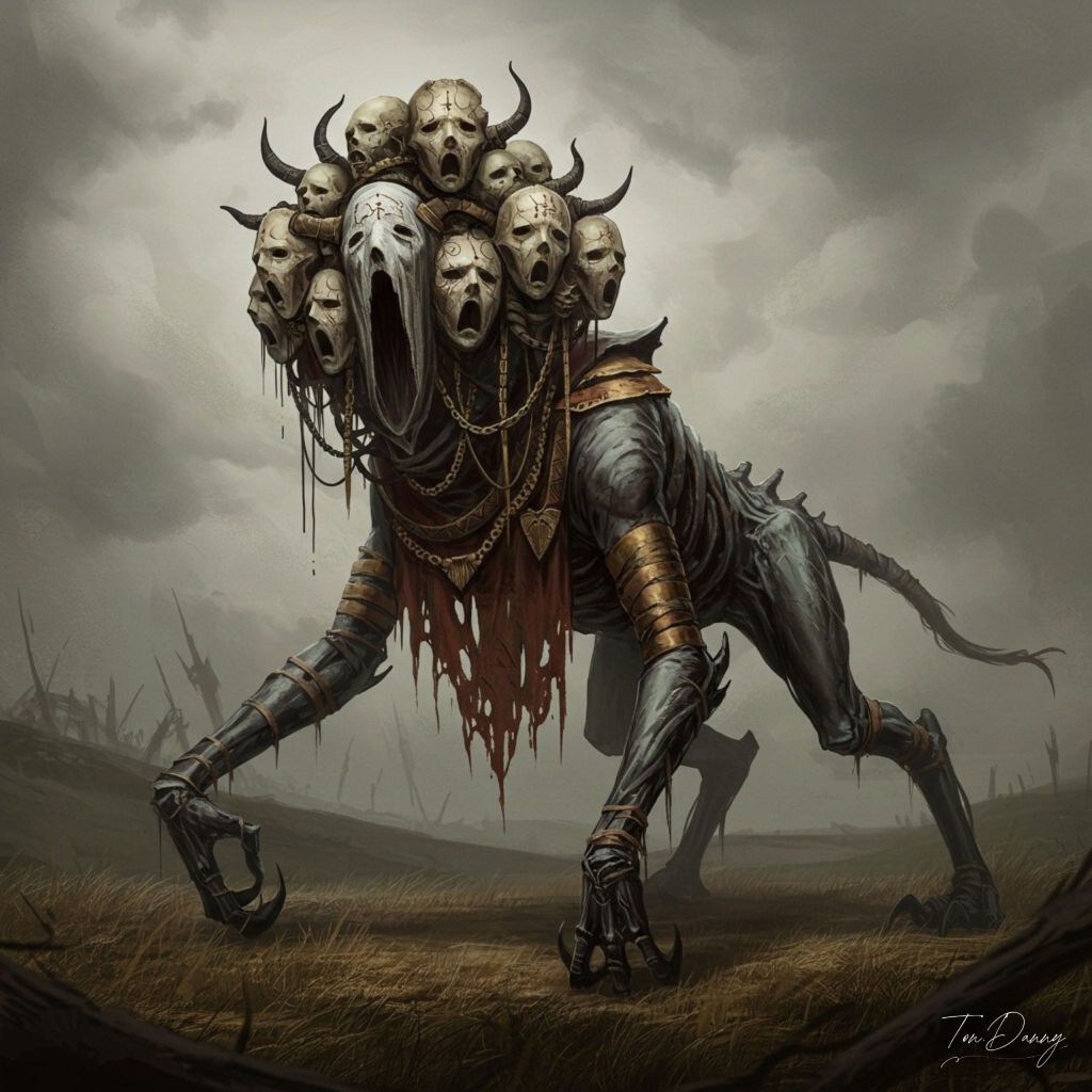 “At the edge of a battlefield long abandoned, where the echoes of conflict still linger in the wind, something stirs beneath the soil of forgotten gods. A four-legged, otherworldly creature emerges, its entire form draped in a tattered ceremonial shroud, worn and stained by the passage of countless ages. Beneath the cloth, its true body remains hidden, ever-shifting—a form composed of interlocking skeletal structures, constantly twisting and reforming, as if shaped by memory and regret rather than flesh. Its head is a cluster of solemn visages, each shaped like a worn, ancient mask, their features faded and cracked, etched with forgotten symbols—names and titles lost to time. The creature’s limbs end in curved, talon-like extensions, their movement gliding just above the ground, as though it walks not on earth, but on the weight of those who once stood in defiance. It does not roar. It does not growl. It simply moves forward, silent but for the creak of shifting bone and the rustling of its flowing shroud. The air around it grows still, the distant wind momentarily silenced, as if the land itself is holding its breath. It does not hunger, nor does it seek conquest. It is drawn only to those who refuse to fade, a silent reminder that some memories—no matter how deeply buried—still walk.”