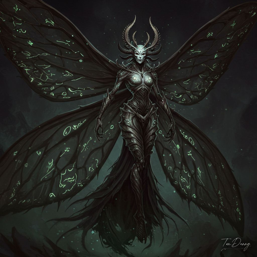 “Where eternal twilight devours the horizon and forgotten dreams fester, the Abyssal Moth Sovereign descends—an ancient, nightmare-born queen who feeds on memory, erasing identity with every silent wingbeat. Her form is unmistakably feminine, but no longer human. Her slender, towering body is clad in a veil of twisted chitin and silken membrane, her limbs jointed like a moth’s yet moving with unnerving grace. Her waist is narrow, her posture elegant, but her flesh is segmented, her skin a blend of translucent shell and pulsating shadow, through which alien glyphs crawl like living veins. Four massive wings extend from her back—tattered, asymmetrical, patterned with ever-shifting sigils that vanish when looked at directly. They shimmer with ghostlight, and from them falls a fine dust of dream-ash, glowing softly as it coats the ground. Each particle carries fragments of forgotten fears and voices never spoken. Her face is hidden beneath a cracked, porcelain mask, sculpted into a serene smile. Beneath the mask, clusters of dimly glowing eyes blink slowly across her brow and cheeks, watching all from every angle. From her temples curve spiraled antennae, and from the base of her skull drape thin tendrils of black silk that move without wind. She does not speak—her voice arrives as a foreign memory, reshaping dreams into silent obedience. She glides, never touching the ground, her presence warping time, her shadow bleeding into reality like ink. She is both queen and parasite, seducer and devourer. Where she passes, identity unravels. Where she lands, even nightmares dare not follow.”