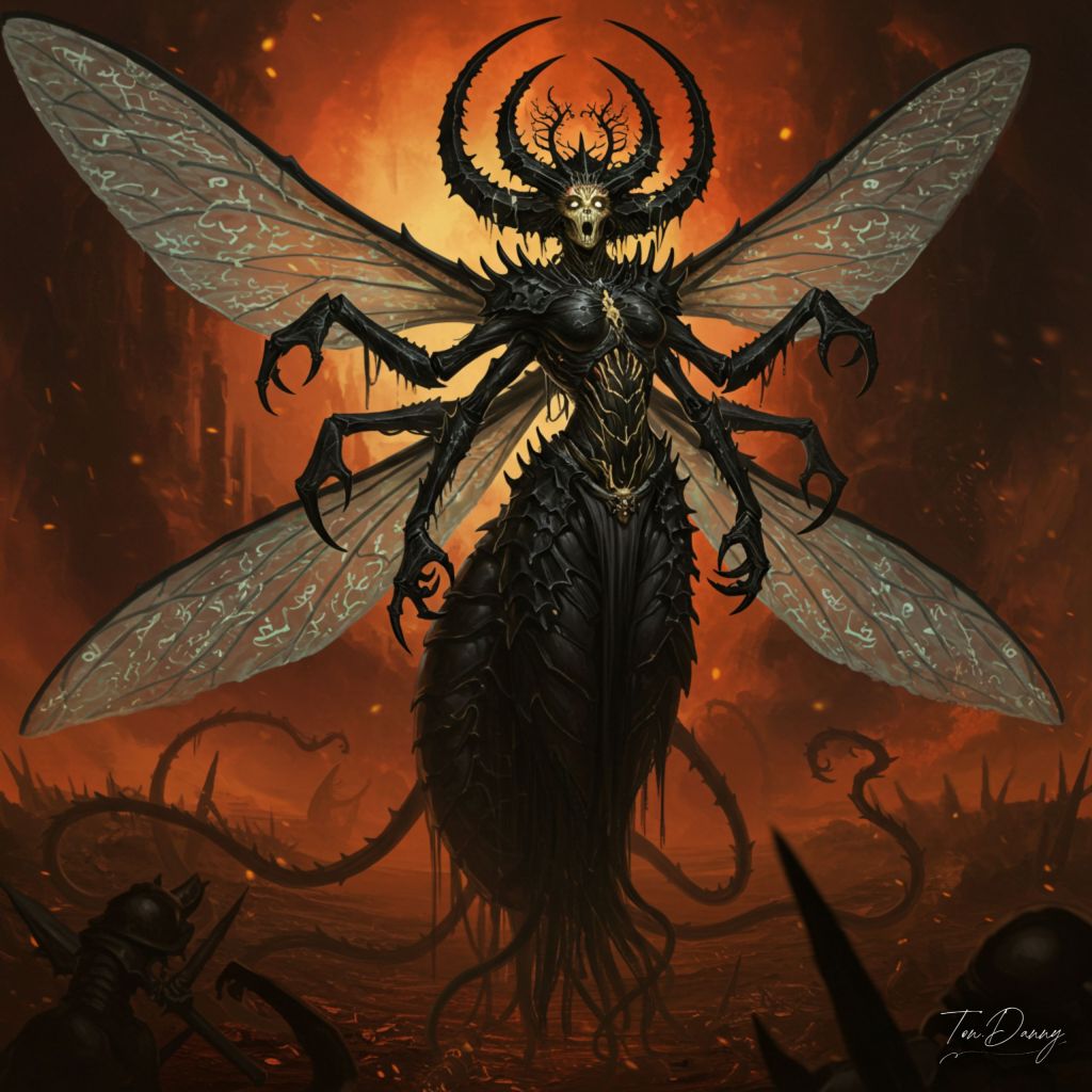 “A towering, insectoid goddess drifts above the scorched wastes of the underworld—an ancient deity of blight and delirium known as the Profane Matriarch of the Plague Swarm. Her form is vaguely feminine yet entirely monstrous, clad in jagged black chitin that cracks and exhales clouds of shimmering, toxic mist. Multiple segmented limbs extend from her sides and back, some ending in razored claws, others constantly twitching, as if guided by unseen wills. From her back spread four warped, translucent wings, veined and torn, their surface crawling with shifting, organic glyphs. Each beat unleashes a discordant, mind-eroding hum that warps perception and weakens resolve. Her head is crowned with a writhing halo of living insects, and her face is a mask of glittering compound eyes and twitching mandibles, devoid of expression yet burning with silent malice. She moves with solemn grace, suspended in the air, her silhouette trailing clawed tendrils that wither the earth below. Her presence alone distorts reality, unraveling thought, erasing the boundary between body and blight. She is no queen. She is no beast. She is the swarm incarnate—ascending, eternal, inevitable.”