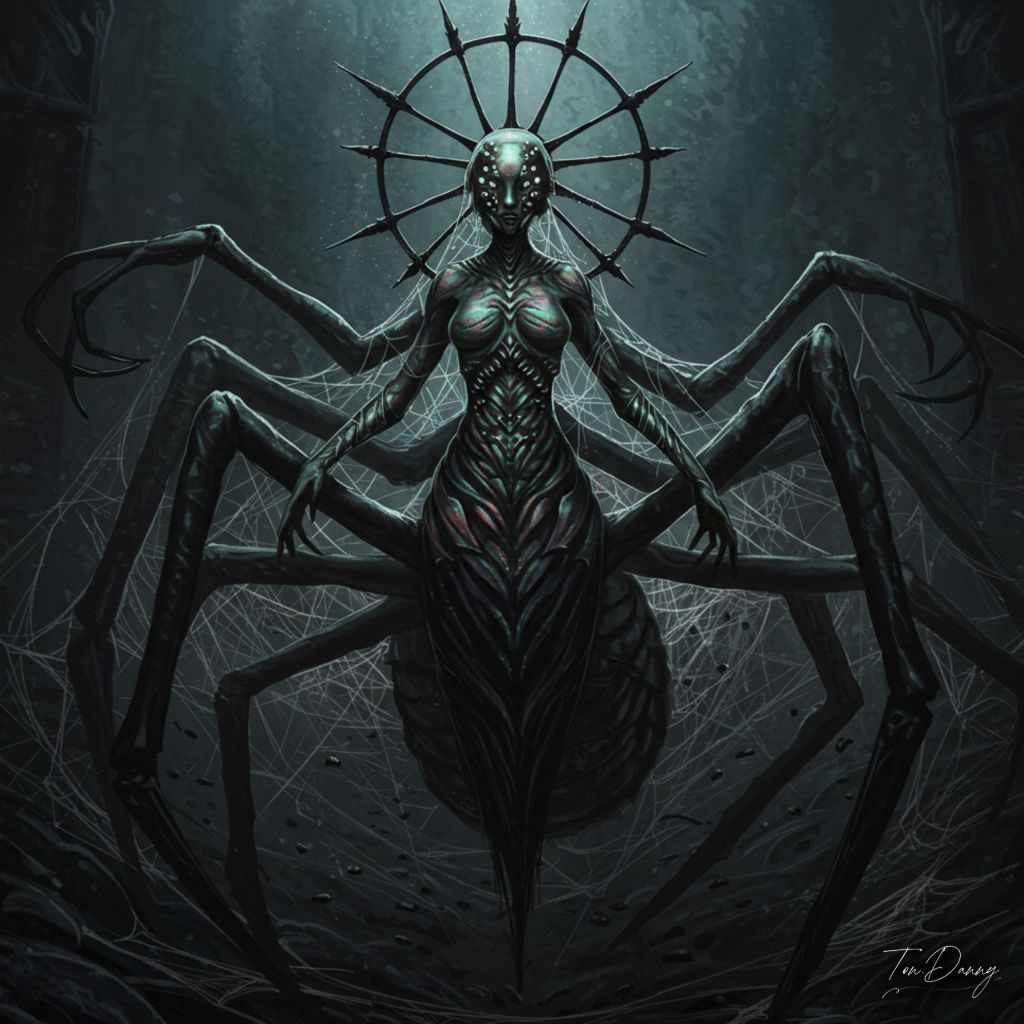 “In the hollows beneath the scorched obsidian earth, where time flows in tangled spirals, the Mother-Web Deity stirs—a goddess of memory, fate, and entrapment, her form suspended at the heart of an impossible labyrinth of living silk. Her body resembles a colossal, humanoid arachnid, with eight elongated limbs that fade into shadow and reappear elsewhere, each one pulling at strands of memory-woven thread that bind reality itself. Her torso is slender and graceful, clad in iridescent carapace patterns that ripple like ancient script, ever shifting. From her back spread a halo of glimmering spinnerets, each spinning threads that whisper forgotten truths. Her face is masked by a smooth, oval shell, beneath which countless pale, glowing eyes blink asynchronously, seeing every thread—past, future, and all lost in between. In her presence, forgotten names echo in the mind, and those who draw near find their memories unraveling into the web. She does not kill. She binds. She remembers. And in time, so too shall you.”