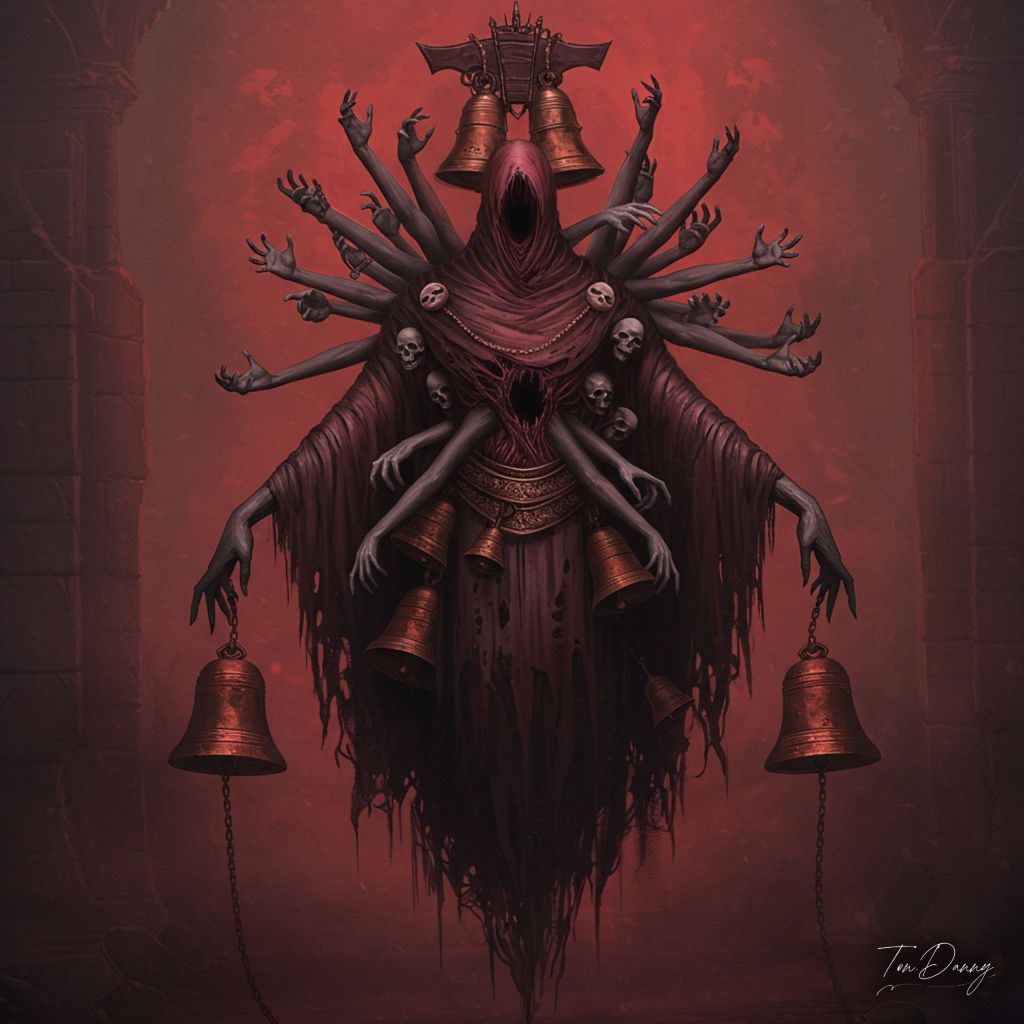 “Deep within the crimson fog of the deadlands, an entity drifts between the worlds, unseen yet ever-present—a being whose existence is heralded only by the sound of a distant bell. The Faceless Bellfiend is not bound by shape. It shifts, twists, expands, a shadow of impossible geometry, its body hidden beneath flowing, tattered vestments, adorned with rusted, bloodstained bells that ring with every motion. It has no face, only a gaping void, within which hundreds of hands claw outward, reaching, grasping, beckoning. Each hand that emerges is not its own, but belonging to those it has taken, each one whispering prayers that no god will ever hear. The sound of its bell does not reach the ears—it reaches the soul, a resonance that paralyzes the will, drains the spirit, and calls the dead from their restless slumber. It does not walk. It floats. It glides. It looms. And when the final toll of its bell echoes through the air, all who hear it know that their time has ended.”
