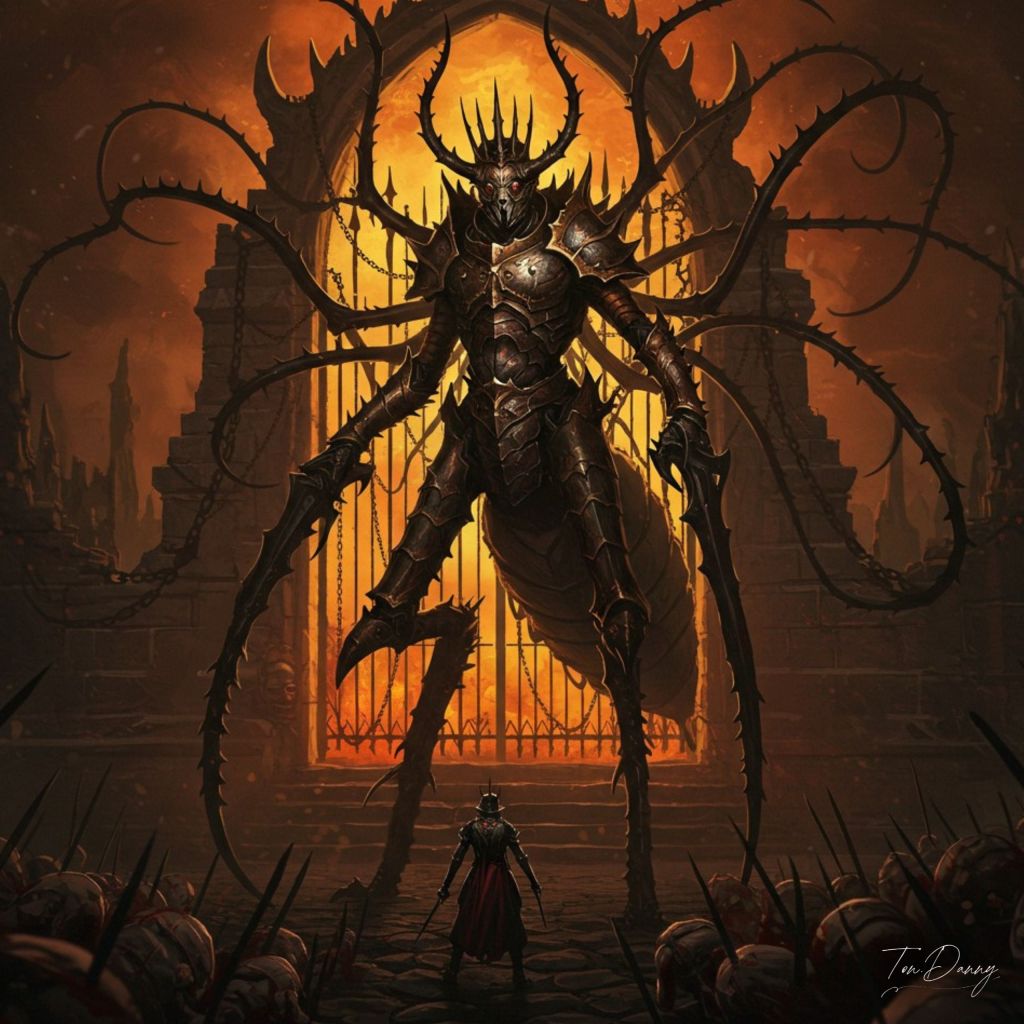 “Standing vigil before the Gate of Unreturning, a massive, skeletal arch wreathed in flame and chains, is a being both sovereign and sentinel—the Insect Emperor of the Hellgate Maw. He is clad in rusted ceremonial carapace, his silhouette regal yet monstrous. His legs are shaped like the barbed limbs of a mantis, and his arms each end in cruciform blades, twitching in anticipation. His elongated neck supports a crowned, wasp-like head, its many eyes dull and ancient, having watched over the condemned for eons. From his back, dozens of segmented, tendril-like limbs coil and uncoil like whips, lashing at the wretched souls who approach the gate in desperation. Each movement creates a sound like cracking bone and weeping steel. He does not speak. He judges by presence alone, and those who are deemed unworthy are impaled on the thorns of his body, suspended in agonized prayer, unable to pass, unable to perish. He is not the final enemy. He is the threshold. And to challenge him is to invite the gate itself to open… inward.”