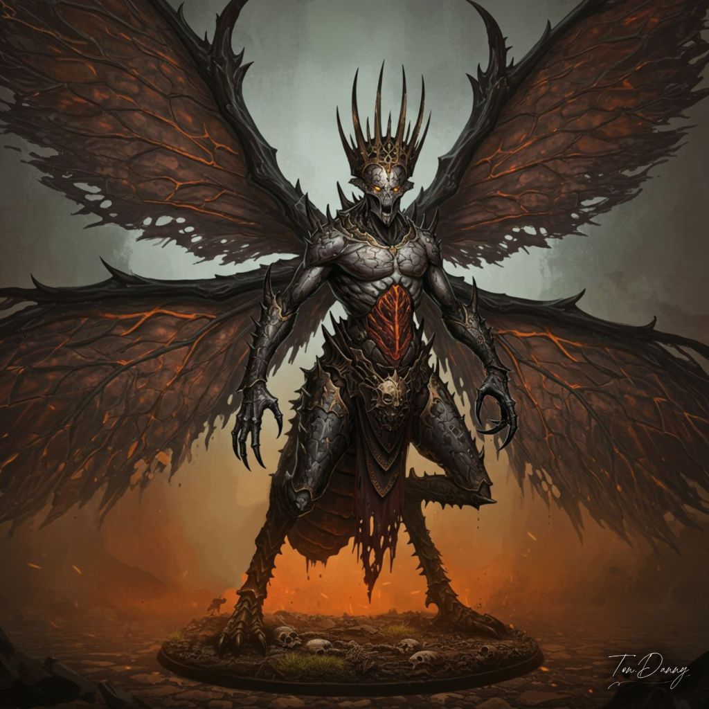 “Beneath the burning skies of the Infernal Deep, where plague winds howl through mountains of broken idols, a monstrous figure descends with the scream of a thousand wings—the Locust-Winged King, herald of desolation. His form is a twisted, towering humanoid fused with locust anatomy, his limbs jagged and folded like bone-spears, covered in blackened, cratered chitin that drips with scorching vapor. From his hunched back, six titanic, veined wings unfurl, torn and tattered, yet unholy in power, beating in slow rhythm to a drone that sows madness in all who hear it. His crowned head bears a visage of cracked stone, fractured to reveal clusters of insectile compound eyes, each burning with cursed flame. His mouth—a vertical maw lined with barbed proboscises—does not speak, but hums a litany of ruin that calls forth plagues across the barren land. Where he lands, the ground cracks, revealing swarms of lesser vermin that crawl from the underworld, gnawing at stone and spirit alike. He is no messenger. He is no god. He is the winged doom that feasts upon the last screams of hope.”