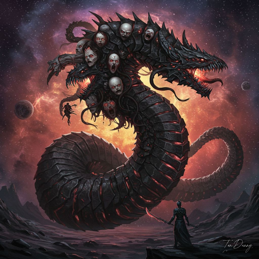 “At the edge of time, where the last embers of creation flicker, a colossal shadow coils through the void—the Devourer of the Final Star, an ancient demon-lord whose form is too vast to perceive at once. Its body resembles a massive, coiled wyrm, composed of obsidian plates and writhing darkness, studded with screaming, pale faces fused into its shell. Its many heads shift and twist, each bearing a different mouth—some insectoid, others draconic, one a silence that devours all sound. Its wings are not wings, but expanding halos of ruin, tearing rifts in the void. As it approaches, the sky dims, stars vanish, and all light bends inward toward its open jaws.”
