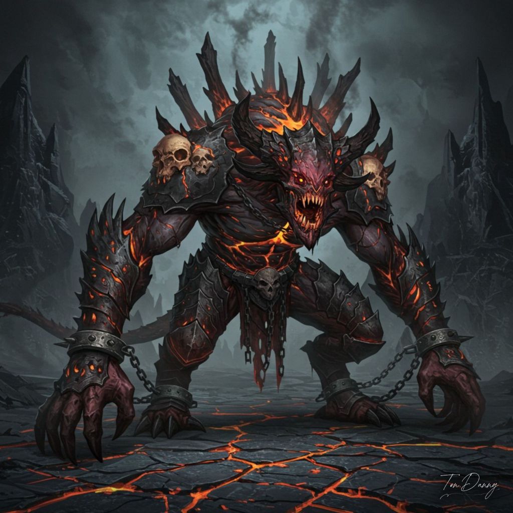 “Chained deep beneath the obsidian crust of the lowest abyss, the Cataclysm-Bound Beast stirs—a hulking entity of pure destruction, imprisoned by forgotten gods. Its body is a fusion of ashen fur, scorched scale, and molten bone, with runes of containment etched into its flesh, glowing with ancient, failing energy. Six massive limbs, each armored and clawed, slam against the crumbling ground as it drags itself forward, wearing its shackles like a crown. Its head bears no eyes—only a gaping, vertical maw that exhales black steam and guttural echoes. From its back rise towers of petrified horns, some broken, others still pulsing faintly with infernal light. Wherever it moves, the earth fractures, and reality itself grows thin.”