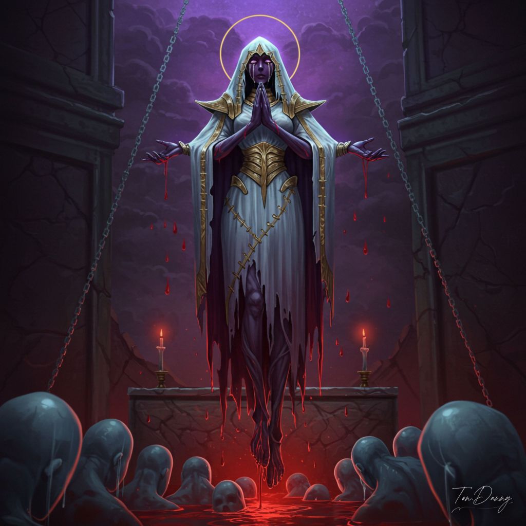 Suspended above a crumbling altar by chains of crystallized sorrow, the Saint Corpse Maiden offers endless prayers through tears of living blood. Her body is wrapped in sacred funeral veils stitched from centuries of grief, and her hollow eyes glow like twilight stars extinguishing one by one. Below her, a congregation of the dead silently weep, bathing in the divine blood that drips from her feet. Each drop births a new wraith, doomed to worship her eternally.