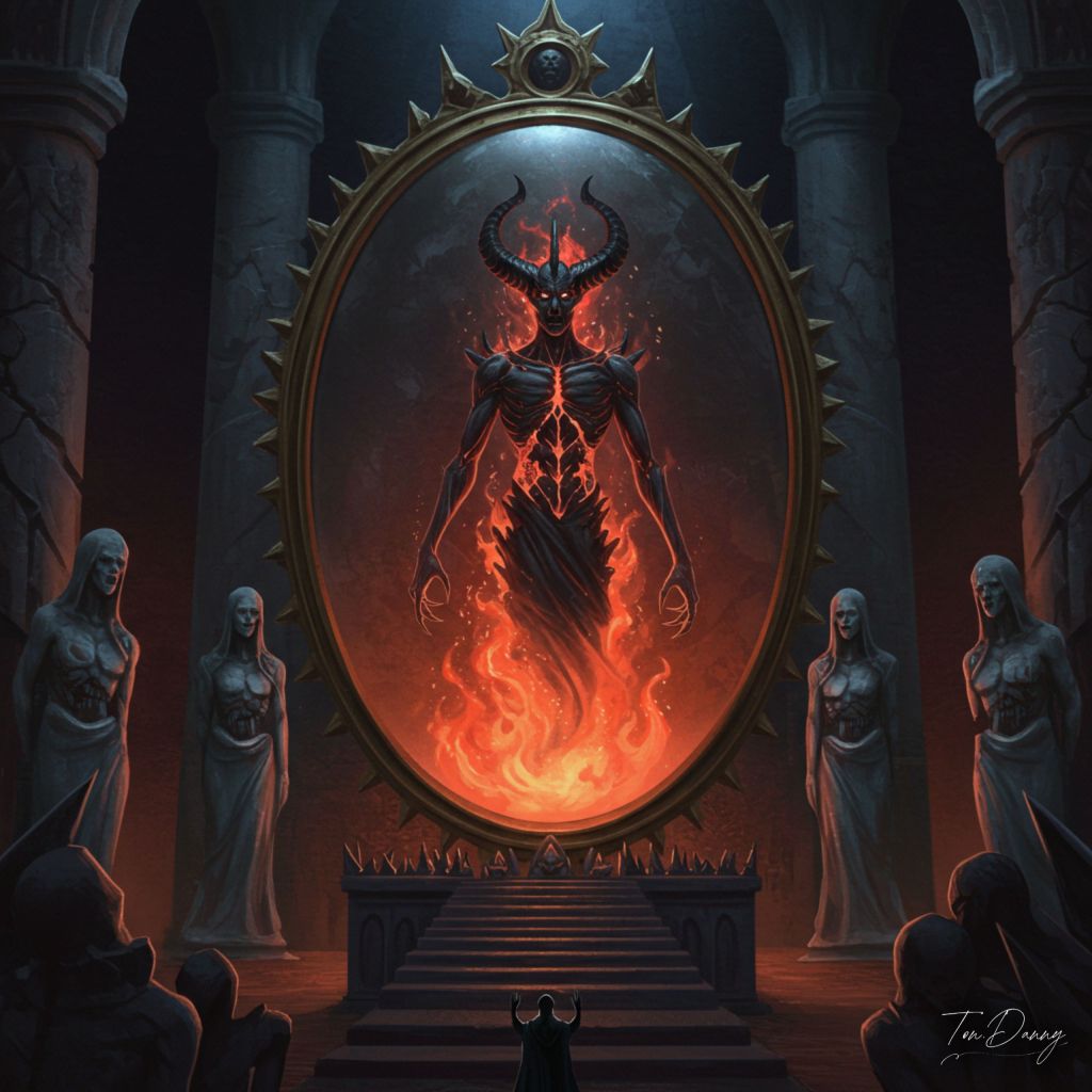 Within a temple of inverted gravity, Harva-Narg dwells inside a massive obsidian mirror, his body visible only as a flickering reflection of fear. His true form is unknown, only glimpsed in the nightmares of those who stare too long. Around the temple, statues of those who looked into the mirror stand frozen in agony, their mouths open in silent screams. When summoned, Harva-Narg emerges as a shattering illusion—half spectral flame, half glass splinter—and tears the future from fate itself.