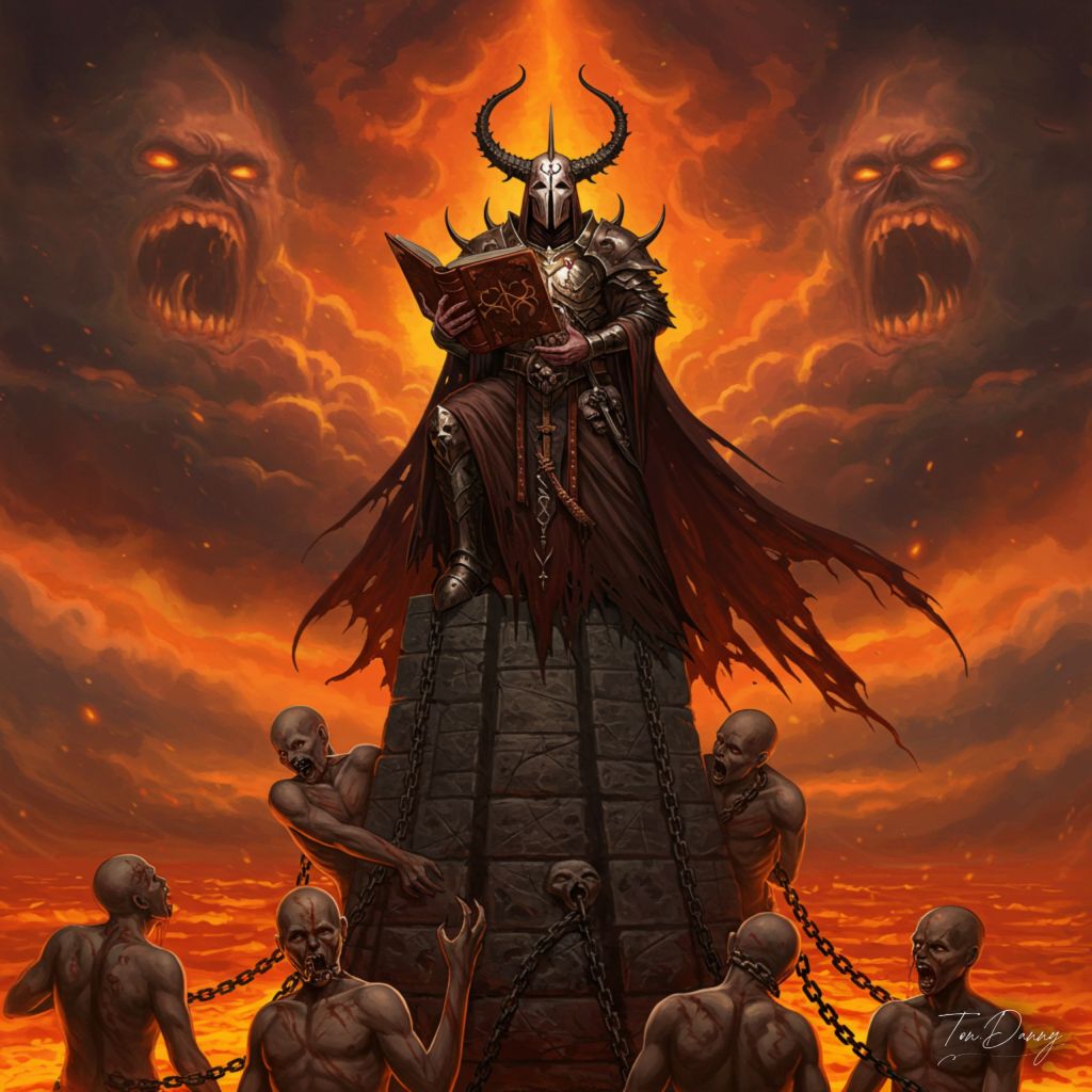 “In a courtyard of scorched justice, the Inquisitorial Effigy stands silent—an ironbound abomination shaped like a judge’s gavel twisted into grotesque humanoid form. Shackled souls are embedded into its ribcage, their eyes open in endless judgment. Flames of damnation pour from the cracks in its rusted plating, and a guillotine-shaped arm swings with silent purpose. Its head, a blindfolded mask of black iron, bears the seal of infernal law. As it moves, the air around it becomes heavy with guilt and terror, and each step leaves behind a burned sigil of punishment upon the blackened floor.”