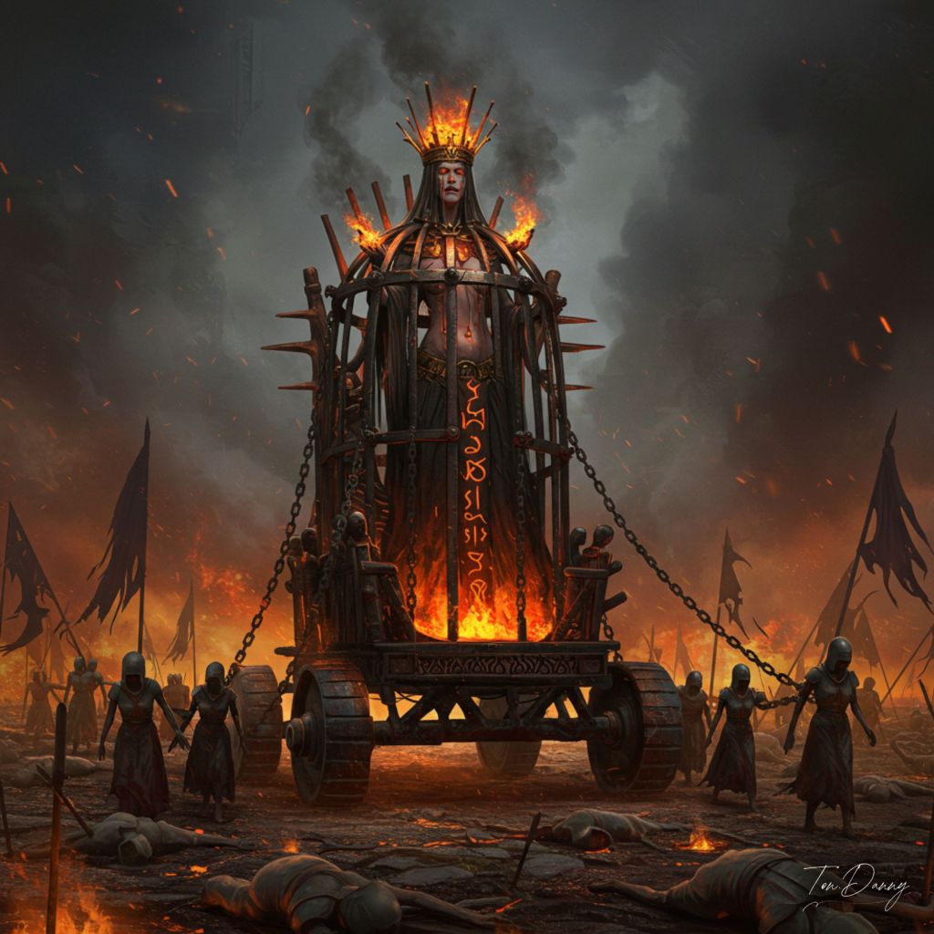 “A towering empress, bound within a mobile cage-throne forged of scorched bone and rusted iron, glides solemnly across a field of silent, charred corpses. Her body is shackled by ceremonial brands, glowing faintly with red-hot script that spells ancient grief. Her face is hidden beneath a veil of ash-stained silk, from which trails of glowing embers cascade like falling tears. Dozens of skeletal handmaidens pull the throne by chains of molten silver, each dragging a broken bell that rings with every tortured step. Her silence resounds louder than screams—the sorrow of one who watches empires burn forever.”