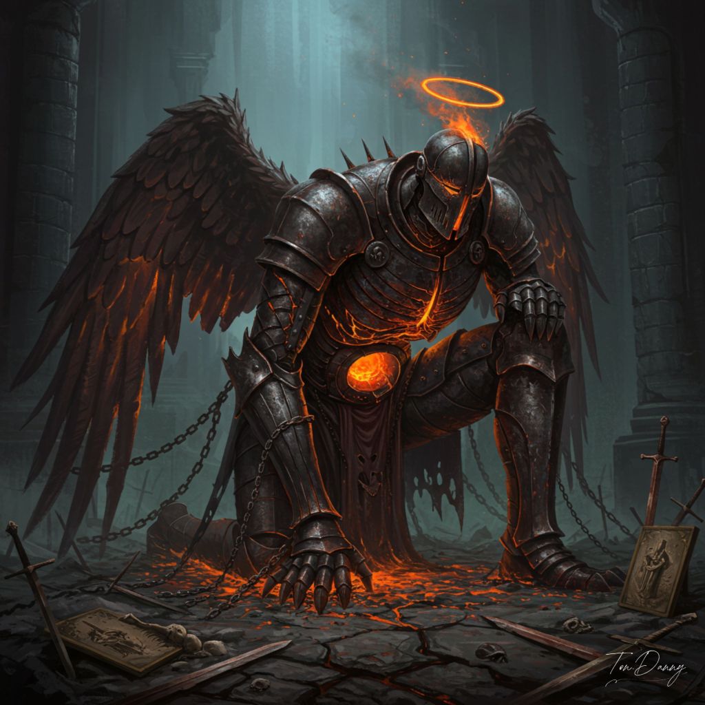 “In the silent ruins of a sunken furnace temple, an enormous iron effigy kneels in eternal penance. Its body, forged from scorched steel and adorned with chains soaked in molten ash, is half-buried in a sea of rusted swords and broken halos. From its eyeless helm drips glowing cinders, and a faint breath of heat escapes from vents etched into its ribcage. Bound to its back are broken furnace doors that swing like wings of judgment. At its feet, long-forgotten offerings of charred bone and cracked icons rest untouched. It does not move, yet its presence bends the air with heavy absolution.”