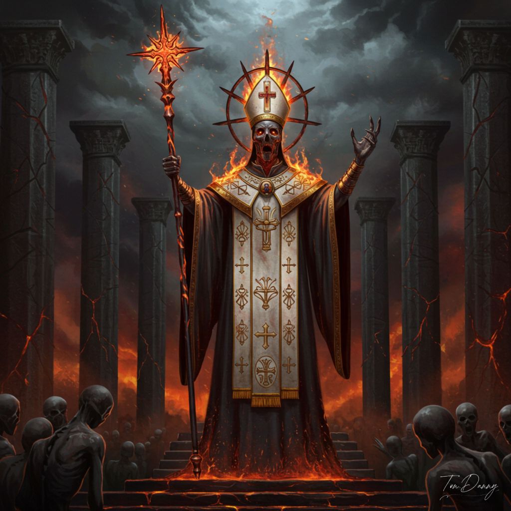 “Standing beneath a sky of blackened fire, the Burnt-Robe Pontiff raises his molten scepter high. His regal robe, once white, is now permanently charred—its sacred embroidery burned into patterns resembling flayed scripture. His face, obscured by a crown of fused halos, radiates no light—only shadow. Behind him, seven monolithic pillars crack and bleed molten stone with every chant he utters. As he preaches in a voice of ash, cursed ash rains upon the faithful—faceless husks who writhe in agony, bound by belief. He is not salvation. He is sacrament by flame.”