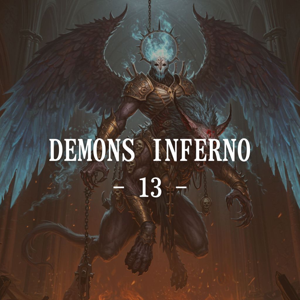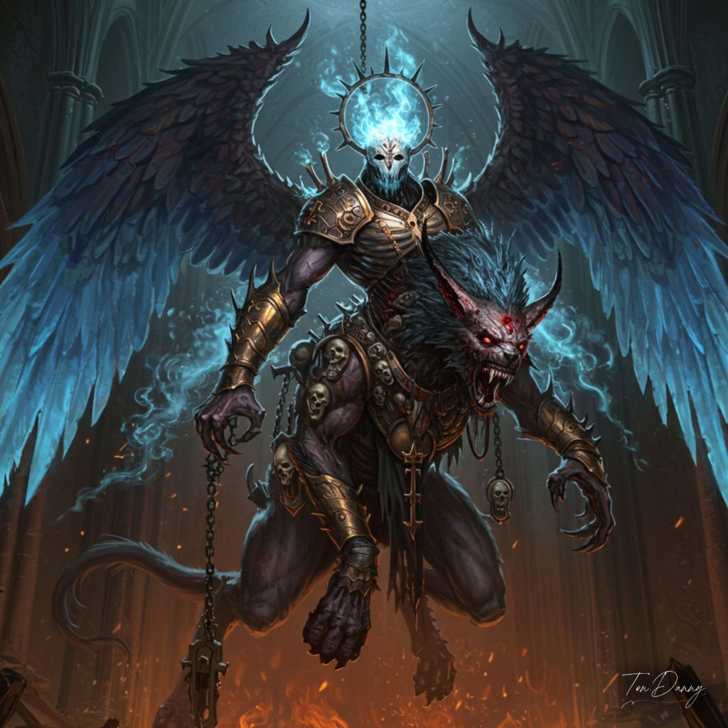 “Hung upside-down by burning chains from the shattered ceiling of a blasphemous cathedral, the Blazebound False Seraph embodies corrupted sanctity incarnate. Six scorched wings writhe in torment, their feathers reduced to trails of blue hellfire that coil like smoke across the dark. A shattered seraphic mask conceals its face, from which white ash bleeds like tears—each flake transforming mid-air into shimmering blades. Its upper body is skeletal, robed in tattered vestments and crowned with inverted halos forged of rusted gold and thorns. Ancient relics, desecrated and fused into its ribcage, pulse with false divinity. Below the waist, its form mutates grotesquely into the massive, quadrupedal body of a demonic griffon: leonine in muscle but lupine in gait, with taloned paws etched with infernal sigils. The beast’s fur is matted with soot and ashes, while its back bristles with relic-fragments and ceremonial fetishes, each one swaying like pendulums of judgment. Its forelimbs—both angelic and bestial—lurch downward in a feral pounce, claws spread wide to grasp souls in mid-scream. The shattered cathedral is filled with spectral light, as flaming stained glass flickers with the last memory of heaven. Beneath, the abyss yawns open. And from above, the False Seraph does not descend. It hunts..”