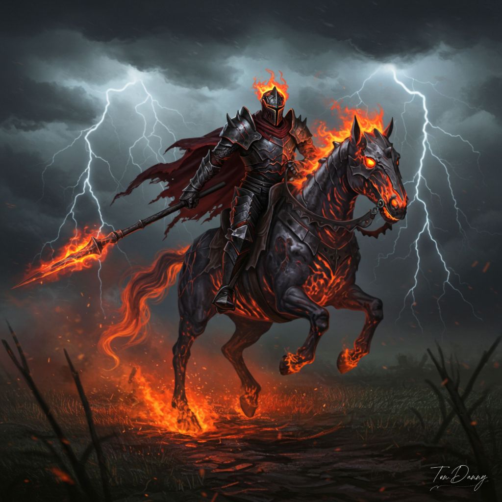 “Riding through a field of perpetual storms, a spectral knight clad in fractured, glowing black armor charges forward atop a skeletal steed wreathed in ghostly flames. The knight’s tattered cloak billows behind it, blending into the swirling tempest of black clouds and crimson lightning. In its hand, it grips a jagged lance infused with malevolent energy, its tip sparking with destructive power. The ground beneath the horse’s hooves turns to ash, leaving a burning trail that lingers long after the knight vanishes into the darkness.”