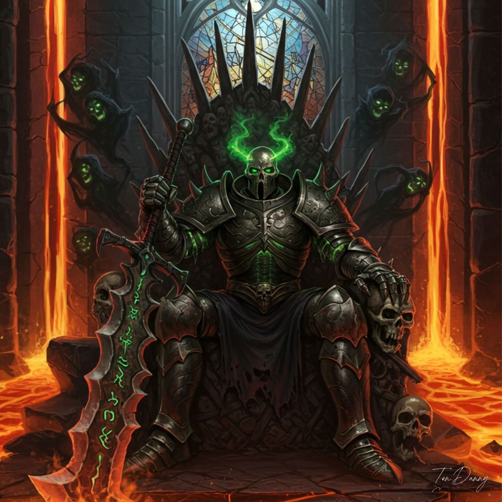“A skeletal overlord sits upon a jagged throne of bones and molten stone, its gauntleted hand gripping the hilt of a massive, cursed greatsword. The blade, etched with glowing, sinister runes, is hefted effortlessly across its shoulder, the tip resting just behind its spiked, skeletal armor. Its hollow eyes burn with a malevolent green light, casting a ghastly glow across the swirling vortex of shadowy wraiths that encircle the throne. The overlord leans slightly into the pose, exuding a sinister confidence, as molten energy pulses faintly through the jagged seams of its armor. The throne room is bathed in an eerie, flickering glow emanating from cracks in the blackened stone walls, and rivers of molten lava carve jagged paths across the floor. Behind the throne, a fractured stained-glass window depicts the fall of a once-great kingdom, its shattered shards scattered across the ground, reflecting the malevolent light of the chamber.”