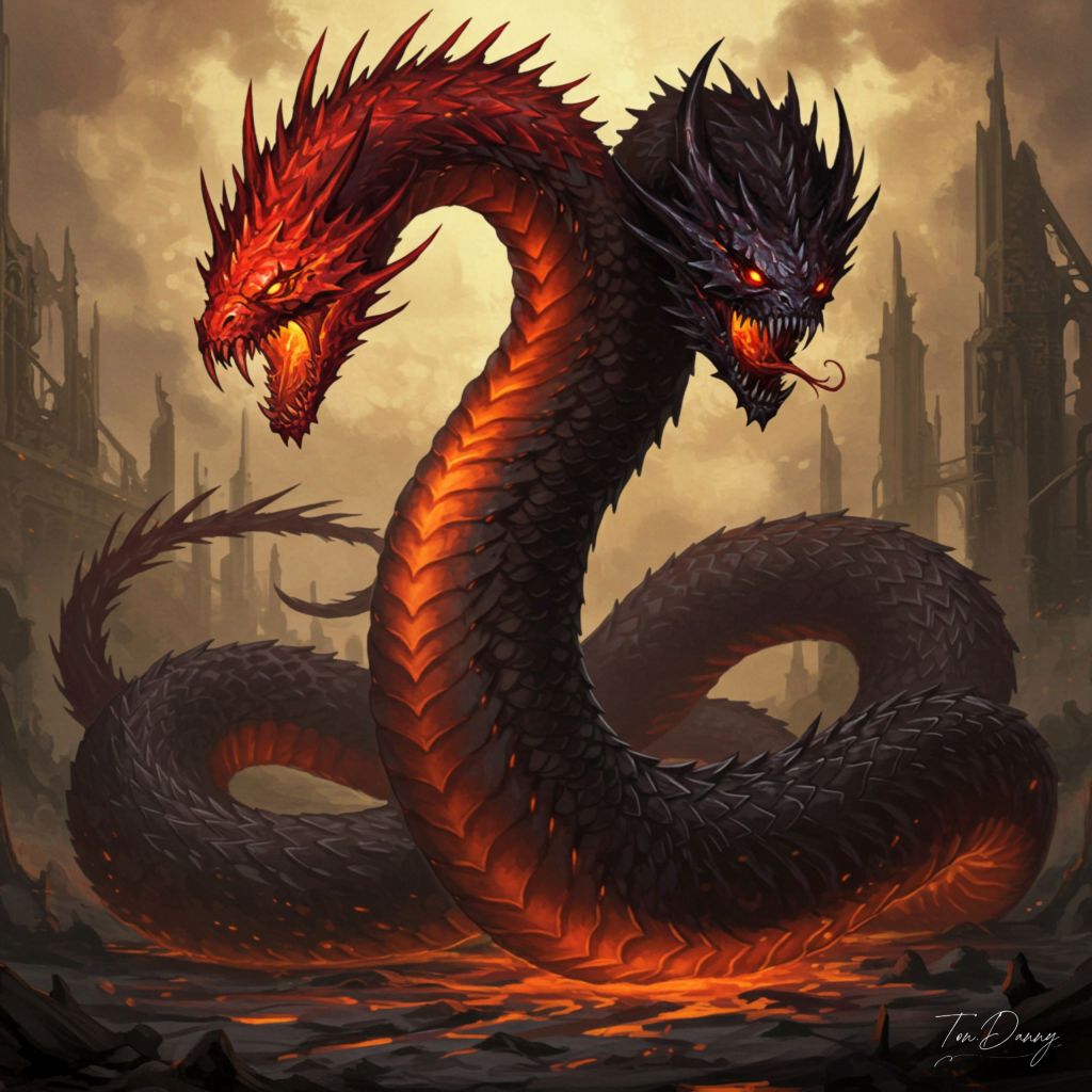“Slithering through the ruins of a cursed city, a two-headed serpent beast leaves a trail of scorched earth in its wake. One head is crowned with jagged crimson spines, its fanged mouth exhaling waves of searing heat, while the other head is shrouded in shadow, its glowing eyes emitting a paralytic aura. The serpent’s scales shimmer with an oily black sheen, and its coiling body radiates an oppressive heat that warps the air around it. As it moves, the wails of the damned echo faintly, carried on a wind that stinks of ash and sulfur.”