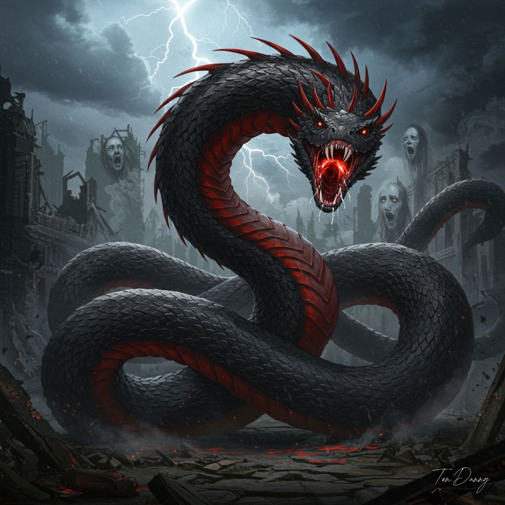 “An enormous serpent slithers through a ruined city, its midnight-black scales reflecting faint flashes of lightning in the stormy sky. Its head is crowned with jagged crimson spines, and its mouth drips with glowing venom that hisses as it touches the ground. The beast’s coiled body moves with terrifying grace, shattering remnants of stone buildings and leaving a trail of blackened earth in its wake. The air around it is thick with swirling black mist, within which faint, ghostly faces appear and vanish, their silent screams echoing in the distance.”