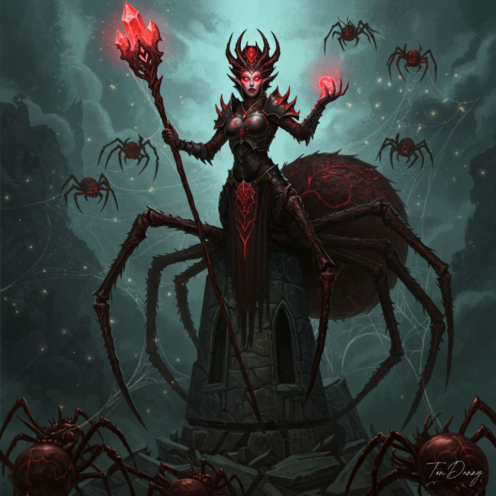 “Perched atop the crumbling spire of an obsidian tower, the Spider Queen gazes over her domain with glowing, malevolent red eyes. Her arachnid lower body glistens like polished black armor, inscribed with pulsating crimson runes, while her humanoid upper half wields a staff crowned with a jagged crystal radiating dark energy. Around her, a sprawling web of shadowy tendrils extends, capturing flickering motes of light like trapped stars. The air hums with the eerie whispers of her brood as countless smaller spiders skitter across the broken stone, awaiting her command.”