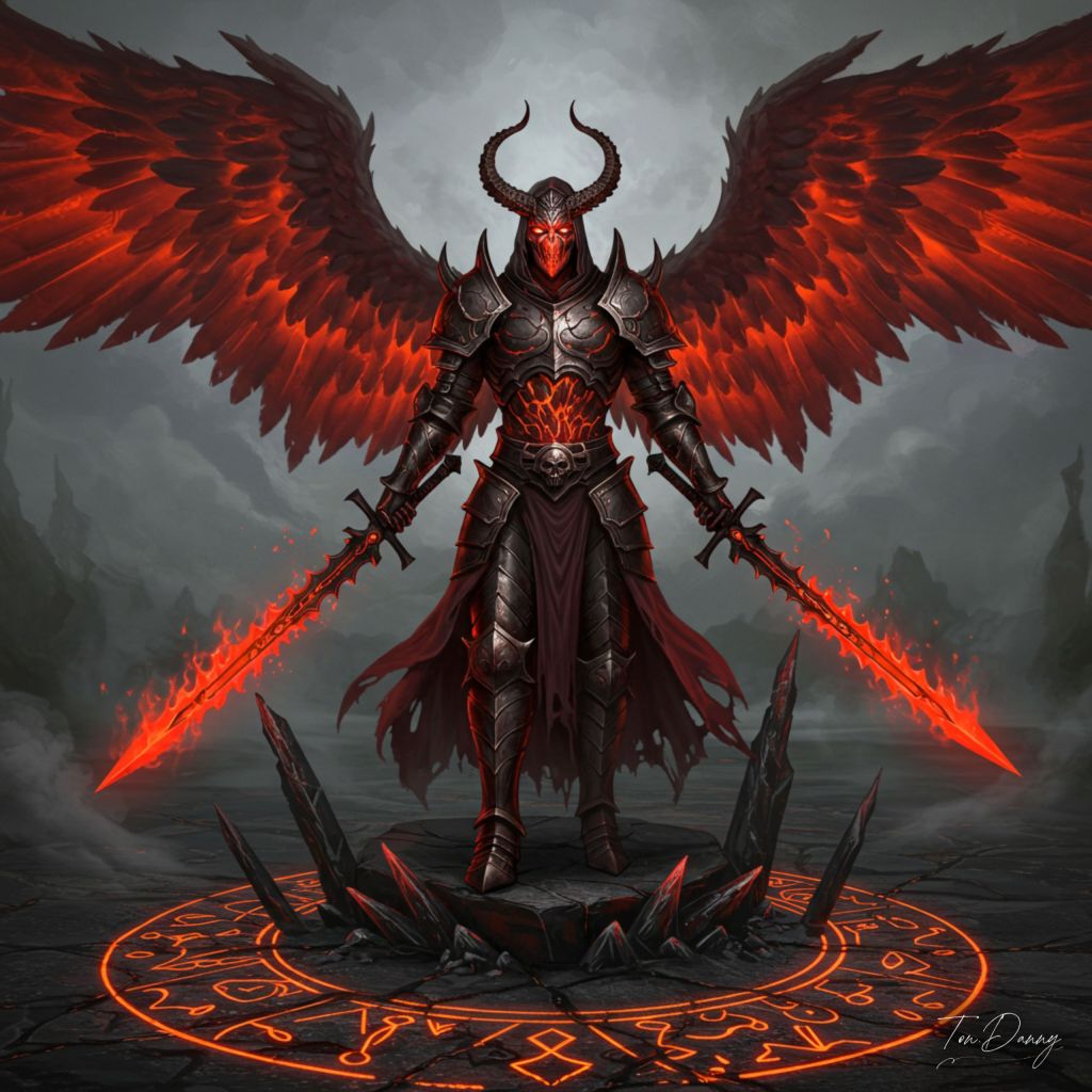 “A fallen angel with tattered, flame-kissed wings stands atop a crumbling obsidian altar in a desolate wasteland. Its blackened armor glimmers with crimson veins of molten energy, and in each hand, it wields a serrated sword radiating dark, fiery auras. Its face is shrouded by a cracked, demonic mask, through which glowing red eyes burn with unrelenting fury. The ground beneath it is etched with glowing sigils that pulse in rhythm with the distant rumble of an approaching storm, and tendrils of smoke and ash coil around its figure, as if drawn to its malevolent power.”