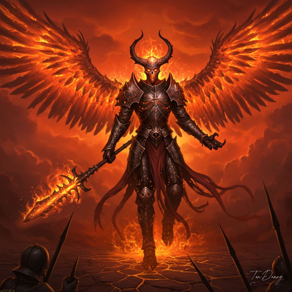 “Descending from a blood-red sky, a fallen angel spreads its massive, tattered wings, which are engulfed in flames that flicker with an unnatural glow. Its once-holy armor is charred and twisted, adorned with spikes and runes pulsating with dark energy. Its skeletal face is crowned with broken, jagged horns, and in its hand, it wields a blazing spear that drips with molten light. Around the angel, the air distorts from the unbearable heat, and the ground cracks open as it lands, summoning waves of fire that ripple through the desolate battlefield.”