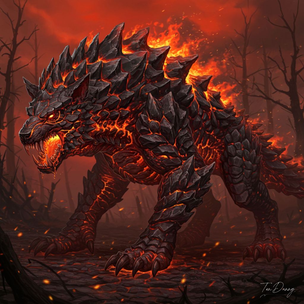“A hulking, quadrupedal beast covered in jagged obsidian scales that glint faintly in the dim, blood-red light of a dying sun. Streams of molten lava seep from the cracks in its armored hide, forming glowing patterns across its massive frame. Its head resembles a wolf, but with elongated, serrated teeth and blazing orange eyes that pierce the darkness. The creature’s tail, ending in a cluster of jagged spikes, swings with destructive force, sending embers into the air. Surrounding the beast is a charred forest, its skeletal trees engulfed in a choking haze of ash and flickering flames.”