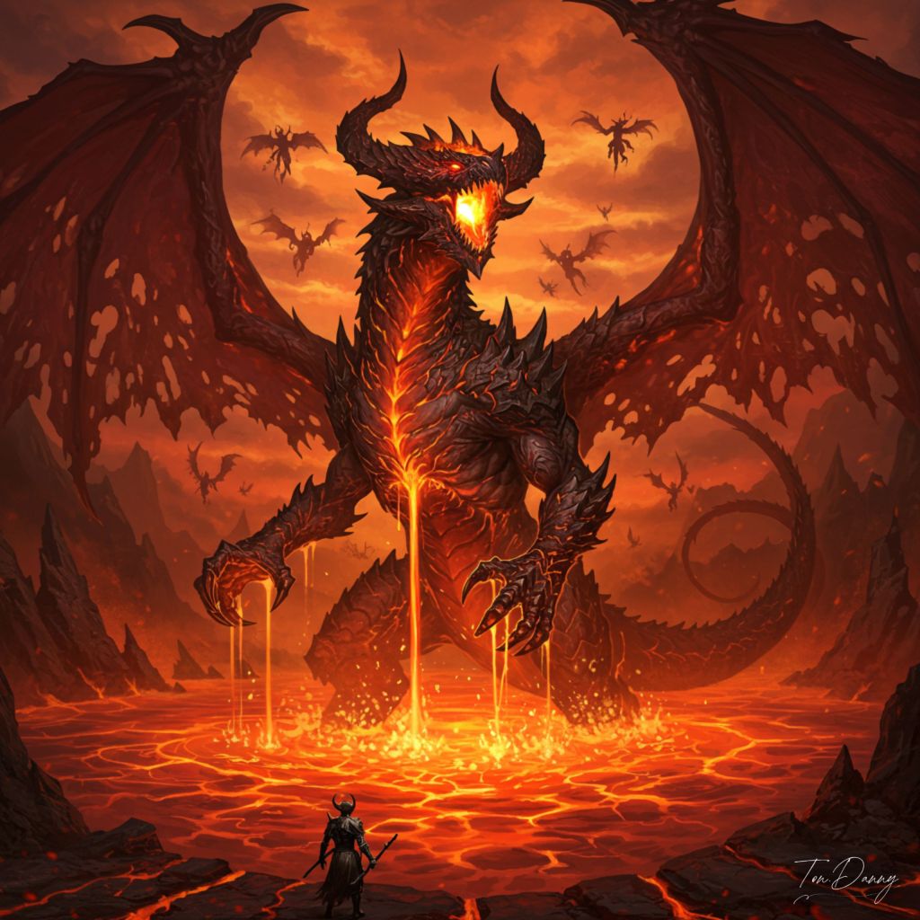 “Rising from a lake of molten fire, a titanic dragon with scales of burning coal and wings of tattered shadow dominates the hellish landscape. Its glowing eyes are twin orbs of infernal light, and its jagged horns crackle with crimson lightning. Lava drips from its claws as it roars, sending shockwaves that shatter the surrounding cliffs and send rivers of fire cascading into the abyss. Above, the sky is a swirling maelstrom of ash and ember, where shadowy figures of lesser demons circle like vultures, awaiting the dragon’s command.”