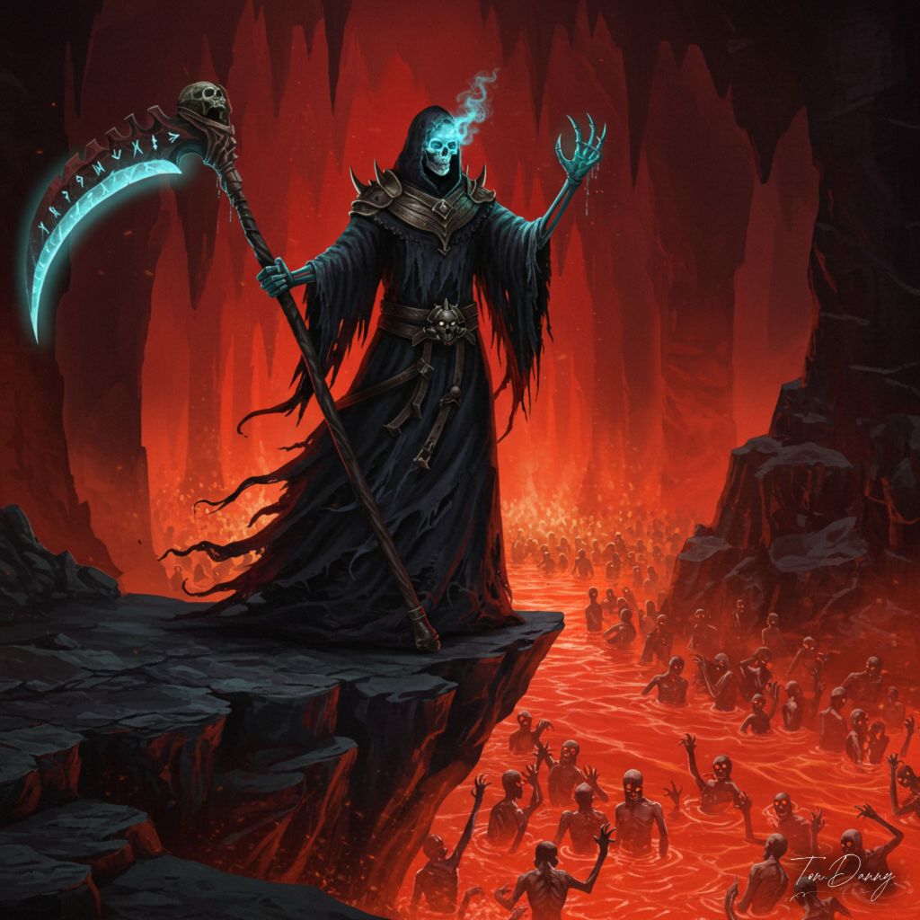 “Standing atop a cliff overlooking the River of Souls, a towering grim reaper wields a massive, rune-covered scythe that glows with malevolent energy. Its skeletal form is shrouded in tattered, shadowy robes that writhe like living darkness. The empty sockets of its skull glow faintly with a cold, ghostly blue light, and its bony fingers drip with an ethereal mist that seems to freeze the air around it. Below, countless souls wail and claw at the river’s burning surface, their despair echoing through the crimson-lit caverns.”