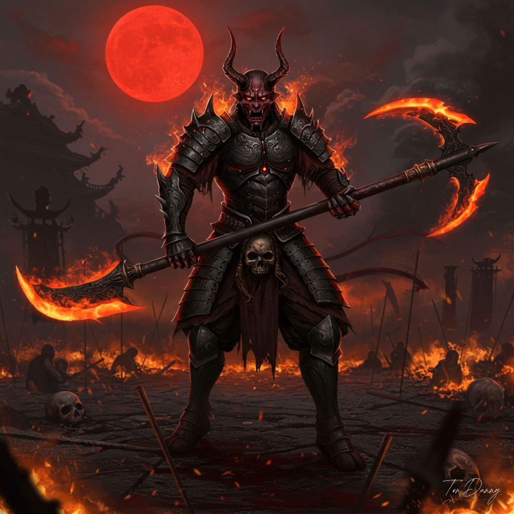 “A fearsome oni warrior clad in blackened, jagged armor stands in the heart of a blood-soaked battlefield. Its crimson horns curve menacingly, and its face is a twisted mask of rage, illuminated by the hellfire that burns within its hollow eyes. In its hands, it wields a massive, dual-bladed naginata, its edges glowing with a fiery aura that seems to consume the very air around it. The ground beneath it is littered with charred bones and scorched earth, as shadowy flames lick at its feet, spreading like living tendrils. A crimson moon looms overhead, casting an eerie glow over the chaos.”
