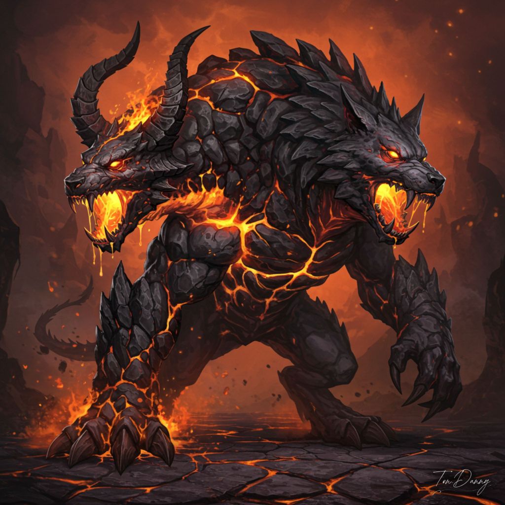 “A monstrous two-headed beast emerges from the fiery depths, its bodies fused from molten stone and shadow. One head resembles a horned serpent, its fiery eyes burning with fury, while the other is a wolf-like abomination with jagged fangs dripping with black venom. Its hulking frame is covered in spikes and flowing magma, and its claws leave trails of molten fire wherever it steps. Surrounding the beast, the ground cracks open, spewing bursts of flame and sulfur, as its deafening roars shake the very foundations of the infernal realm.”