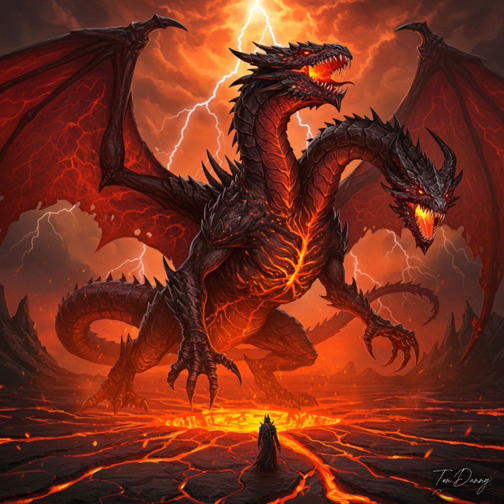 “From the depths of a fiery rift in the earth, a monstrous dragon emerges, its body twisted and grotesque. Its scales shimmer like liquid obsidian, reflecting the hellish light of its surroundings. Its wings are elongated and webbed with veins of glowing red fire, and its serpentine neck splits into three heads, each snarling with jagged teeth dripping molten lava. Spikes of black bone protrude along its spine, and its tail ends in a barbed stinger that drips with acidic venom. The sky above churns with storms of ash and crimson lightning, as the ground quakes with its every movement.”
