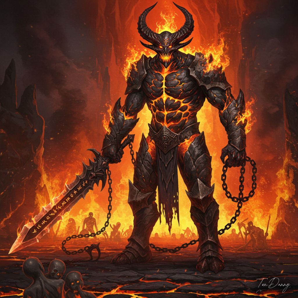 “A colossal demon stands at the gates of a fiery abyss, its body forged from molten rock and jagged obsidian, veins of lava coursing through its cracked skin. Its four glowing eyes burn with an unholy fire, and its gaping maw reveals rows of jagged, magma-dripping teeth. In one clawed hand, it wields a massive chain whip wreathed in flames, while the other drags a shattered greatsword etched with cursed runes. Around it, tortured souls writhe within the flames, their screams blending with the roar of the inferno. The air is thick with ash and smoke, and the ground trembles with every step the guardian takes.”