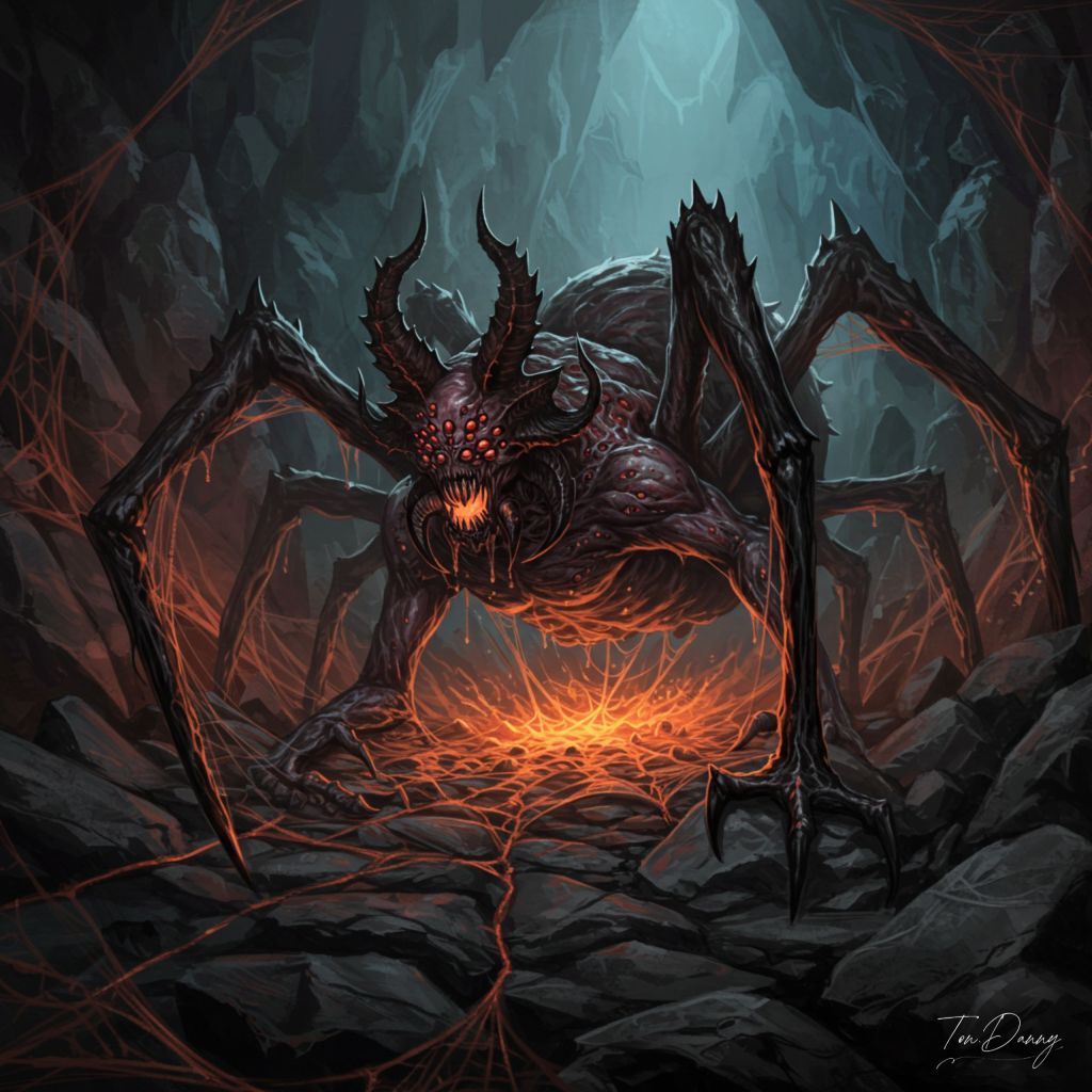 “Emerging from a chasm of endless darkness, a massive spider demon crawls into view, its bloated body glistening with viscous black ichor. Each of its eight legs is lined with jagged spikes, dripping with glowing venom that sizzles upon contact with the ground. Its head bears a grotesque, humanoid face, twisted in a permanent expression of malice, and its many crimson eyes glint with cruel intelligence. Around it, strands of glowing, blood-red web stretch across the jagged rocks, pulsating as if alive. The faint whispers of trapped souls can be heard echoing from the strands, begging for release.”