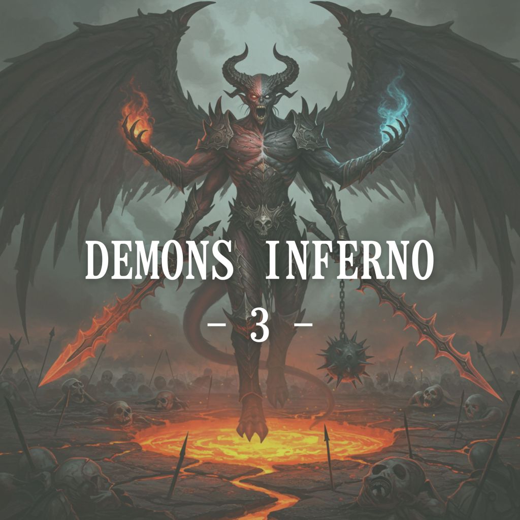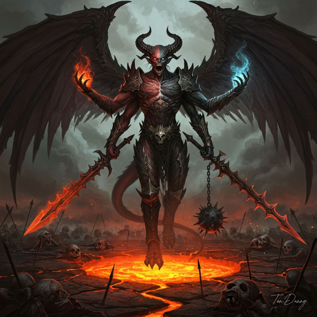 “A colossal demon with two faces—one malevolent and twisted with rage, the other eerily calm and cold—rises above a battlefield of charred corpses. Its body is cloaked in shadowy tendrils that writhe like living smoke, obscuring its true form. Massive black wings, jagged and torn, extend from its back, exuding an aura of despair. In its six clawed hands, it wields cursed weapons: a flaming sword, a jagged spear, and a spiked flail, each pulsating with dark energy. The ground beneath it cracks open, revealing a glowing pit of molten lava that threatens to consume everything in its path.”