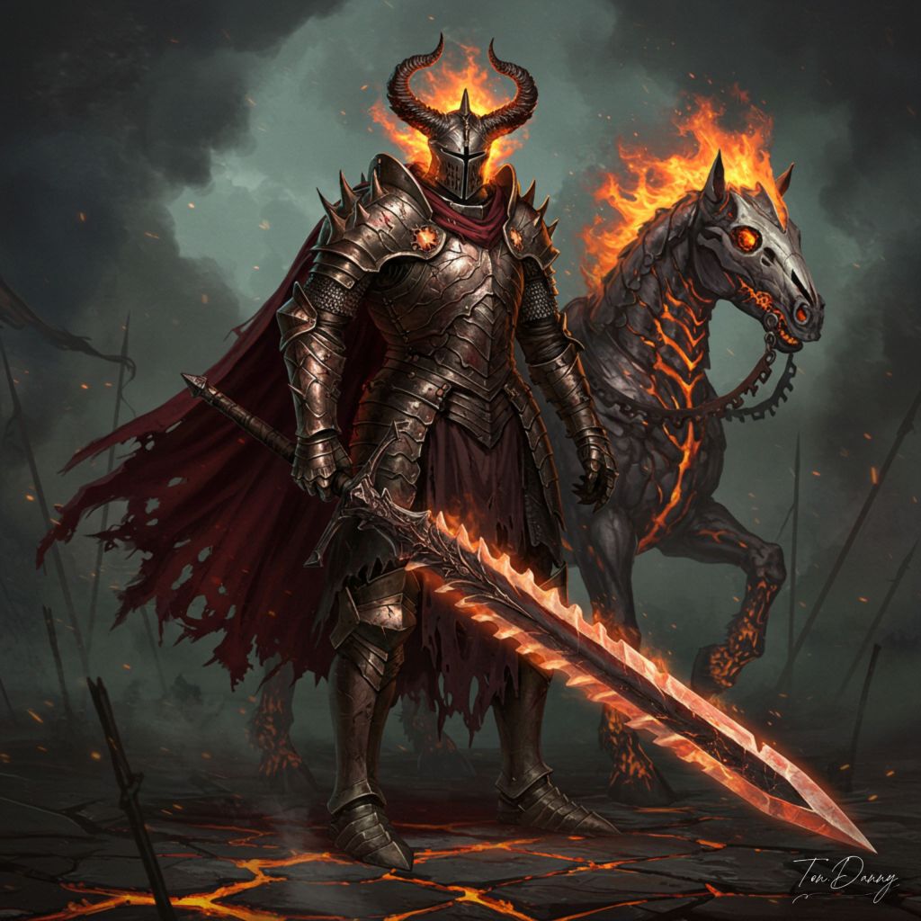 “An infernal knight clad in cursed, spiked armor stalks the battlefield of an eternal war. Its helmet, shaped like the skull of a beast, glows faintly with the fire of its unholy soul, and its cape is tattered and scorched, trailing embers as it moves. In its gauntleted hands, it wields a massive, serrated sword that seems to drink the light around it, leaving only shadows in its wake. The knight’s steed, a skeletal warhorse with flames erupting from its joints, stomps the ground, leaving molten hoofprints in the cracked earth. A haunting chorus of wails echoes through the sulfur-choked air as the knight advances.”