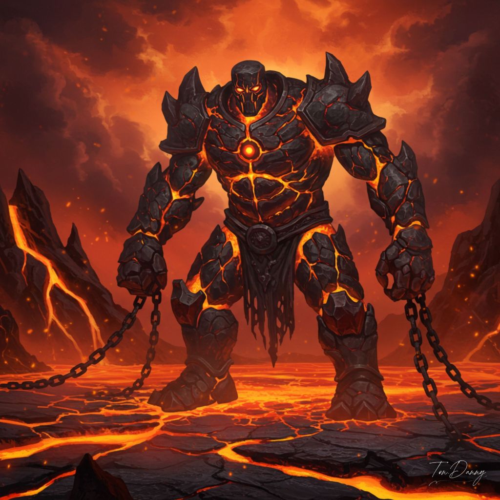 “A towering, hulking golem forged from molten rock and black iron emerges from a volcanic chasm. Its entire body is cracked and glowing with fiery veins, and massive iron chains dangle from its wrists, dragging across the molten ground. Its head is featureless, save for a single blazing eye at the center of its forehead, glaring with unrelenting fury. Each step it takes sends tremors through the land, and waves of heat distort the air around it. Ash rains from the crimson sky, as smaller demons scatter before its overwhelming presence.”