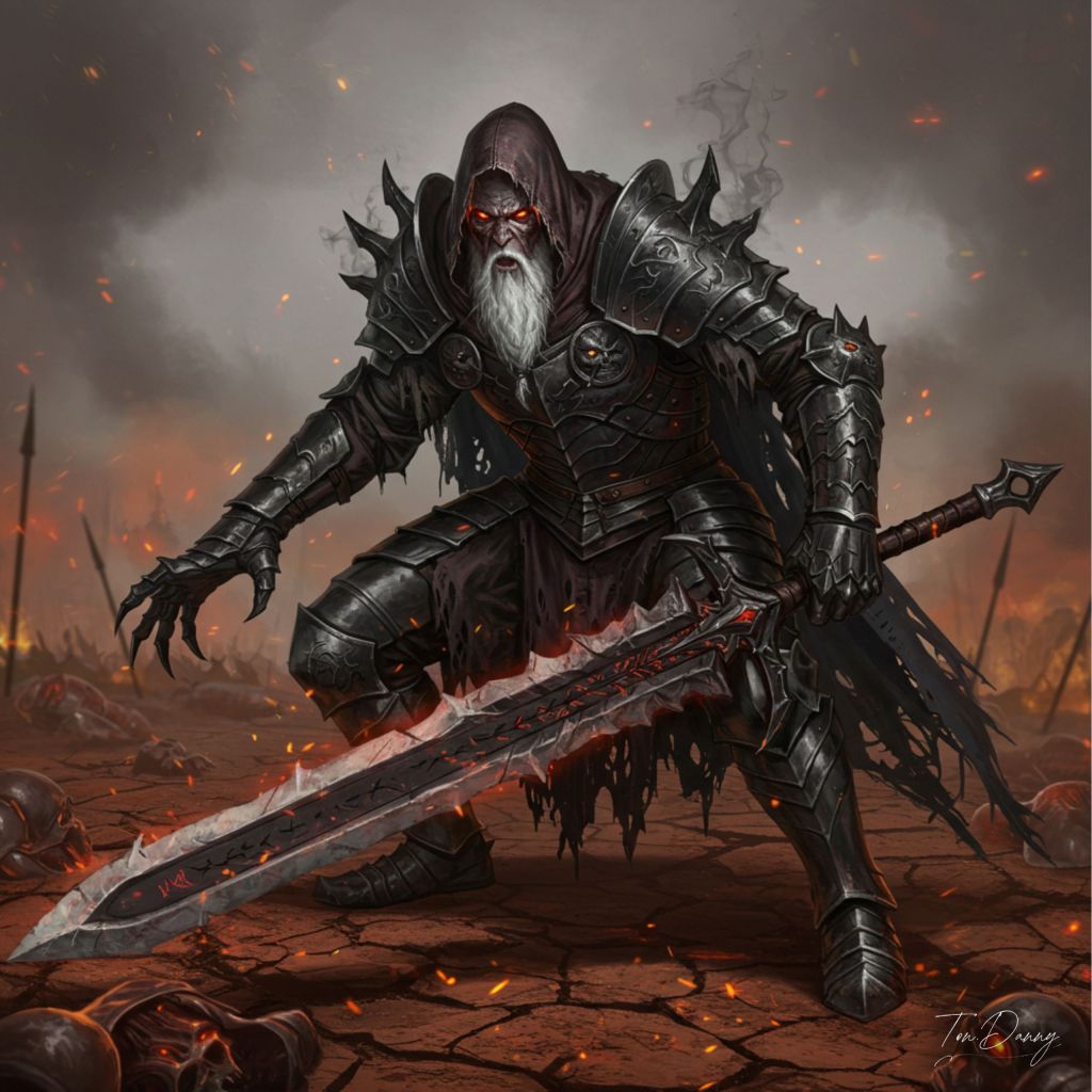 “In the heart of a battlefield long forsaken, where the charred remains of warriors litter the cracked earth, a lone figure crouches, his stance low and predatory, exuding an aura of relentless ferocity. His presence alone twists the air, sending ripples of raw, chaotic energy through the scorched landscape. The wind howls, not in nature’s song, but as a dirge for those who dare meet his gaze. His armor, a grotesque fusion of blackened metal and living darkness, is warped and jagged, seemingly shaped by an ancient, malevolent force. Sharp, overlapping plates interlock like the scales of a nightmarish beast, shifting and twisting as he moves. Engraved with eldritch runes that glow a sickly violet, the metal itself appears to breathe, exhaling faint trails of cursed mist. His gauntlets end in serrated, claw-like extensions, designed not just for war, but for rending flesh and tearing through the souls of his prey. His tattered cloak, woven from shadows, coils and writhes behind him, as if possessed by an unseen will. Beneath the tattered brim of his ancient, spellwoven warlock’s hat, his face remains shrouded in darkness, save for a wild, unkempt white beard that flows like spectral smoke. His eyes, burning slits of molten silver, dart with animalistic precision, scanning the battlefield for his next victim. His breath, ragged and heavy, carries the scent of embers and death. In his hands, he wields a massive, shattered greatsword, its jagged blade exuding trails of dark fire and ghostly mist. The sword’s broken edge crackles with unstable energy, warping the air as if struggling to exist between dimensions. With every slight motion, the weapon hums, resonating with the cursed souls trapped within its core, their muffled wails lost beneath the wind. His grip is tight, fingers digging into the hilt as if restraining an uncontrollable beast yearning for carnage. His posture is low, poised like a ravenous predator ready to pounce. His movements are erratic, twitching with unnatural speed, his muscles coiling like a beast waiting for the moment to unleash unrelenting devastation. The battlefield around him seems frozen in time, as if reality itself hesitates in the face of his presence. And then, in a sudden blur of motion, he lunges. The ground shatters beneath his feet, flames erupting from the cracks as his cursed blade carves through the air. To witness him in battle is to glimpse the wrath of a godlong forgotten—raw, untamed, and insatiable.”