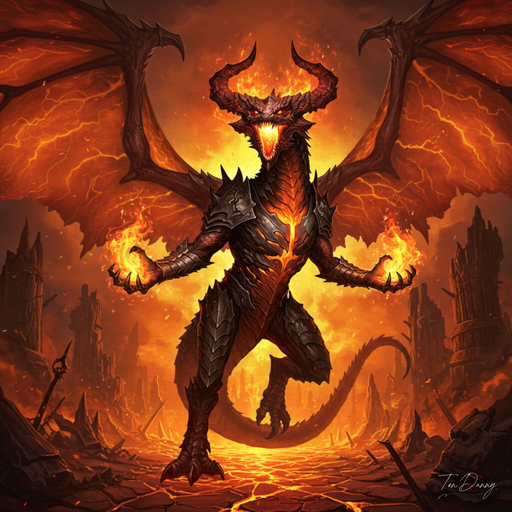 “Coiling through the flaming ruins of a desecrated citadel, the Hellgate Twin-Horned Wyrm unfurls its colossal wings, each membrane streaked with burning veins of infernal energy. Its twin, jagged horns pulse with dark fire, twisting like a cursed crown upon its monstrous head. Its molten-gold eyes burn with insatiable fury, and its jagged, armored scales glisten with the blood of those who dared defy its rule. As it roars, the very air ignites, and the ground below fractures, revealing the glowing chasms of hell itself. The flames that surround it are no mere fire, but living, writhing entities that consume all in their path, leaving only smoldering shadows in their wake.”