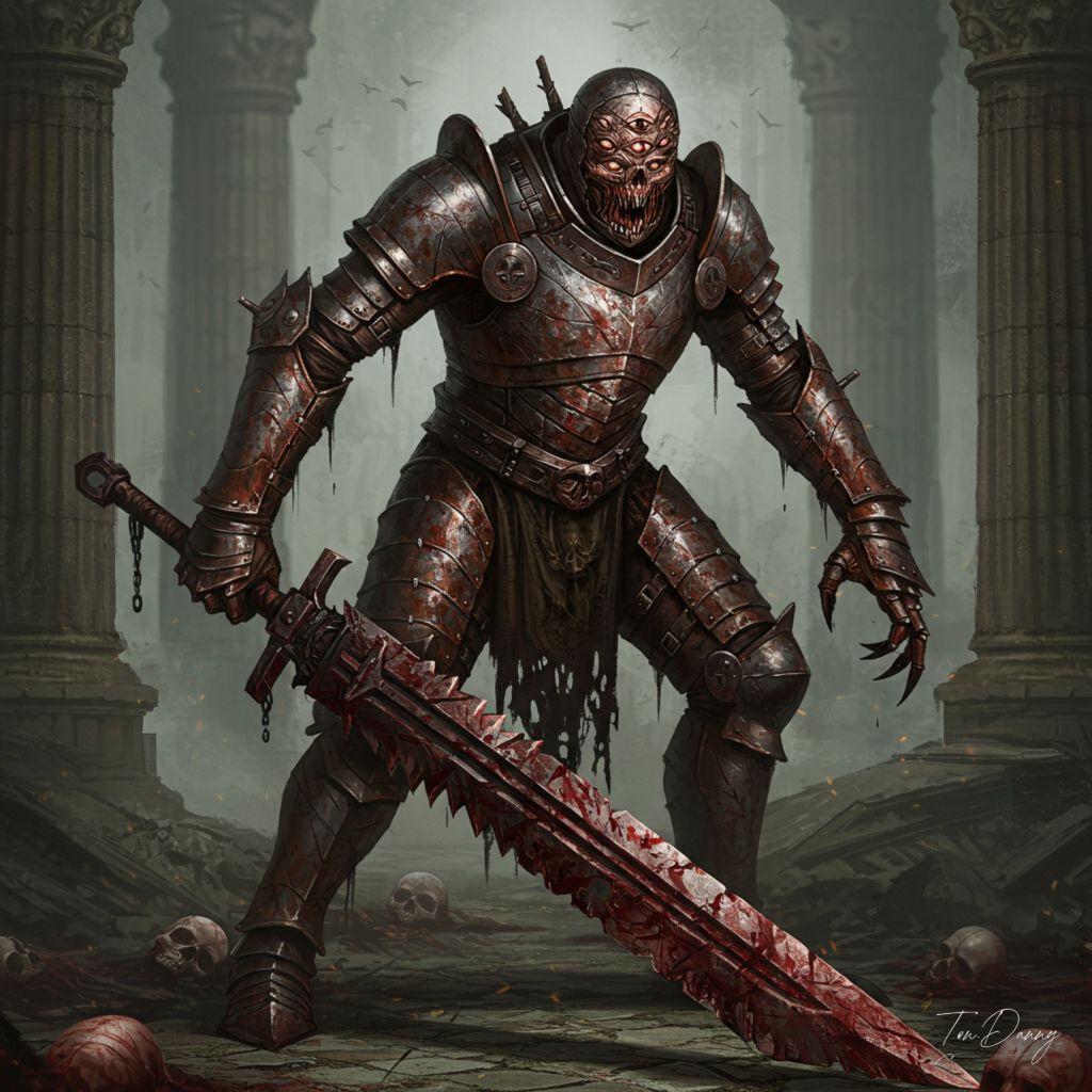 “A towering, armored monstrosity stands amid the ruins of a desecrated temple, its grotesque form wrapped in rusted iron and crude metal plating. Where a face should be, there is only an unblinking mass of shifting, silver eyes, each reflecting the last moments of those who dared to stand before it. Its arms, twisted and elongated, end in monstrous, clawed gauntlets that still drip with black ichor from its last slaughter. Instead of a sword, it wields a colossal, jagged slab of metal—an executioner’s blade, rusted and cracked, yet pulsing with unnatural energy. Its stance is low and unstable, like a rabid beast moments away from a frenzied assault. As it moves, the very air vibrates with an unsettling hum, and the voices of those it has slain whisper through the wind. The ground beneath it is scorched, not with fire, but with the remnants of those whose souls it has devoured, their forms still lingering in the shifting shadows at its feet.”