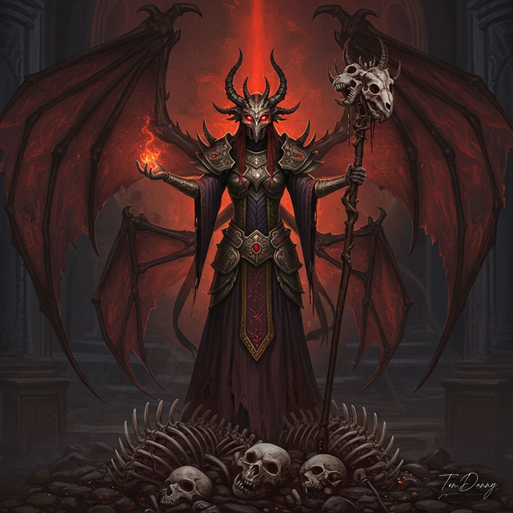 “Standing at the heart of an ancient ruin swallowed by darkness, a towering figure shrouded in tattered ceremonial robes whispers forbidden incantations. Her face, hidden behind an ornate, dragon-carved mask, reveals only her burning crimson eyes, exuding an aura of inescapable doom. Her elongated fingers trace glowing runes into the air, each sigil pulsing with draconic power that warps reality itself. From her back, six enormous skeletal dragon wings emerge, their bones blackened and cracked, wreathed in ghostly fire. The wings do not flap; they hover in eerie stillness, emanating a terrible presence. At her feet, a writhing pit of dragon bones churns, the remnants of her forsaken kin bound eternally to her will. In her right hand, she grasps a staff crowned with the severed head of an ancient dragon, its hollowed eyes still glowing with the embers of long-lost fury. With each whispered command, the bones at her feet tremble, and the echoes of forgotten titans stir, ready to be unleashed upon the world once more.”