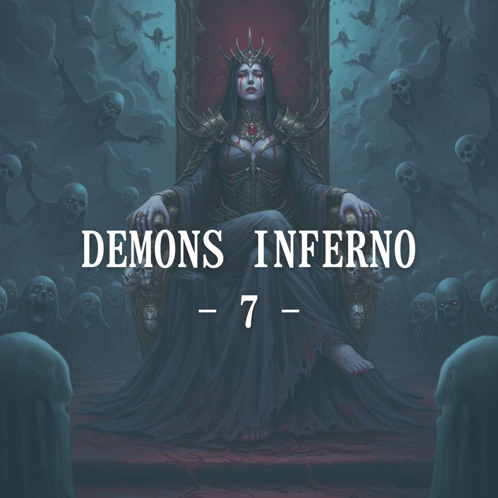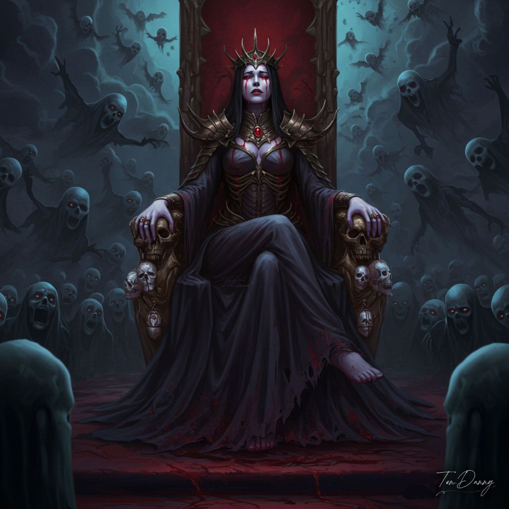“Seated upon a blood-drenched throne of decayed bone and petrified flesh, the Bloodweeping Corpse Empress gazes upon her accursed domain with hollow, sorrowful eyes. Her face, pale as the dead moon, is streaked with trails of crimson tears that never cease to flow, staining the tattered, dark silk of her regal gown. Her skeletal fingers are adorned with rings, each holding a trapped soul that flickers with agony. Around her, countless wraiths kneel in silence, their featureless faces turned upward in eternal worship. The blackened sky above writhes with the silhouettes of winged phantoms, screaming in voiceless despair. Yet she does not move—she simply mourns, her sadness more terrifying than any rage.”