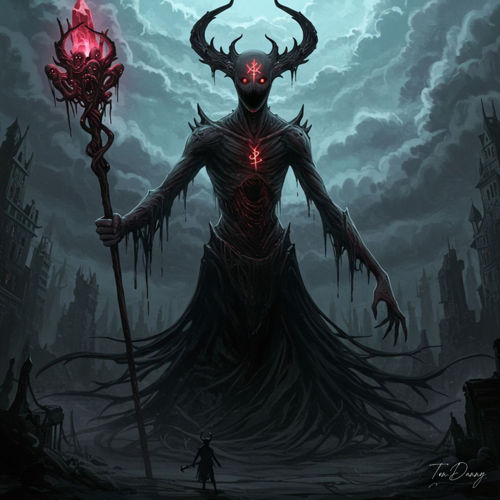 “From the depths of an eternal void, a towering, faceless entity emerges, its form shifting like liquid darkness. Its elongated limbs stretch unnaturally, tendrils of ink-black mist coiling around its grotesque, featureless face. A single, burning red sigil hovers where its eyes should be, pulsing with an eerie rhythm. As it moves, reality itself distorts, the surrounding structures warping and crumbling as if recoiling from its presence. In one skeletal hand, it grips a twisted staff crowned with a glowing, abyssal crystal, from which shadowy figures writhe and whisper in forgotten tongues. The air is heavy with the scent of decay, and the sky above fractures, as if the world itself is rejecting the being’s existence.”