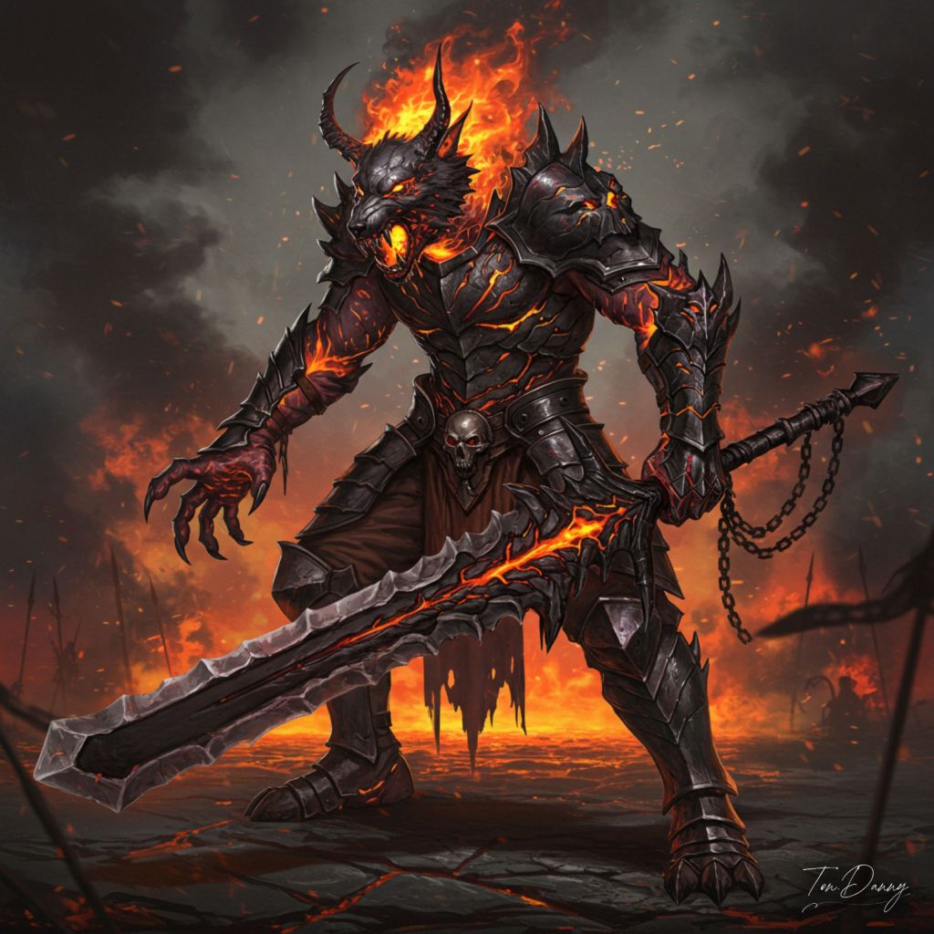“From the depths of a smoldering battlefield, a monstrous swordsman emerges, his body a grotesque fusion of man and beast. His muscular frame is clad in jagged, blackened armor that seems to grow from his own flesh, pulsating with veins of molten energy. His head, that of a demonic wolf with glowing ember-like eyes, snarls as thick smoke rises from his fanged maw. In his clawed hands, he wields a colossal, serrated greatsword forged from obsidian and bound with cursed chains that rattle with every movement. The blade hums with chaotic energy, its surface cracked and glowing as if barely containing the inferno within. His posture is low, like a predator poised to strike, his armored talons digging into the scorched earth. Every breath he takes releases plumes of sulfuric smoke, and with each step, the ground trembles beneath his unnatural might. Surrounding him, the spirits of the fallen howl in agony, their spectral forms tethered to his blade, forever feeding the cursed hunger of the beast that wields it.”