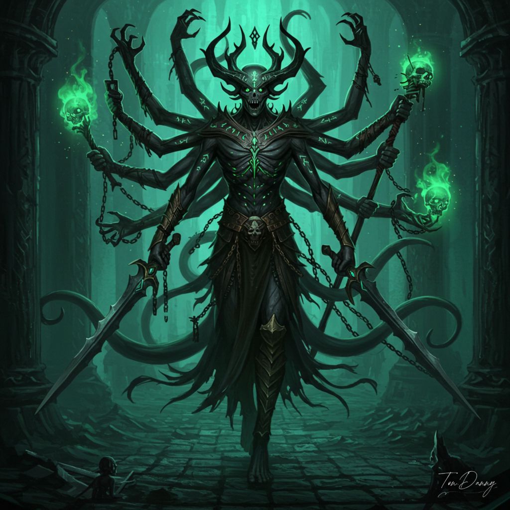 “Within the endless corridors of the Abyssal Tower, a monstrous entity moves with unsettling grace, its thousand elongated arms coiling and shifting through the darkness like grasping tendrils. Its head, featureless save for a single vertical eye, radiates a sickly green glow, illuminating the intricate runes and symbols carved into its ebon flesh. Each of its hands wields a different cursed weapon—blades jagged and rusted, chains dripping with spectral fire, and staffs carved from the bones of forgotten gods. Its movements are soundless, save for the faint whispers of the damned that echo through the void with every motion. It does not hunt—those who enter the tower inevitably find themselves within its grasp, their souls woven into the eternal nightmare that is the Abyssal Tower.”