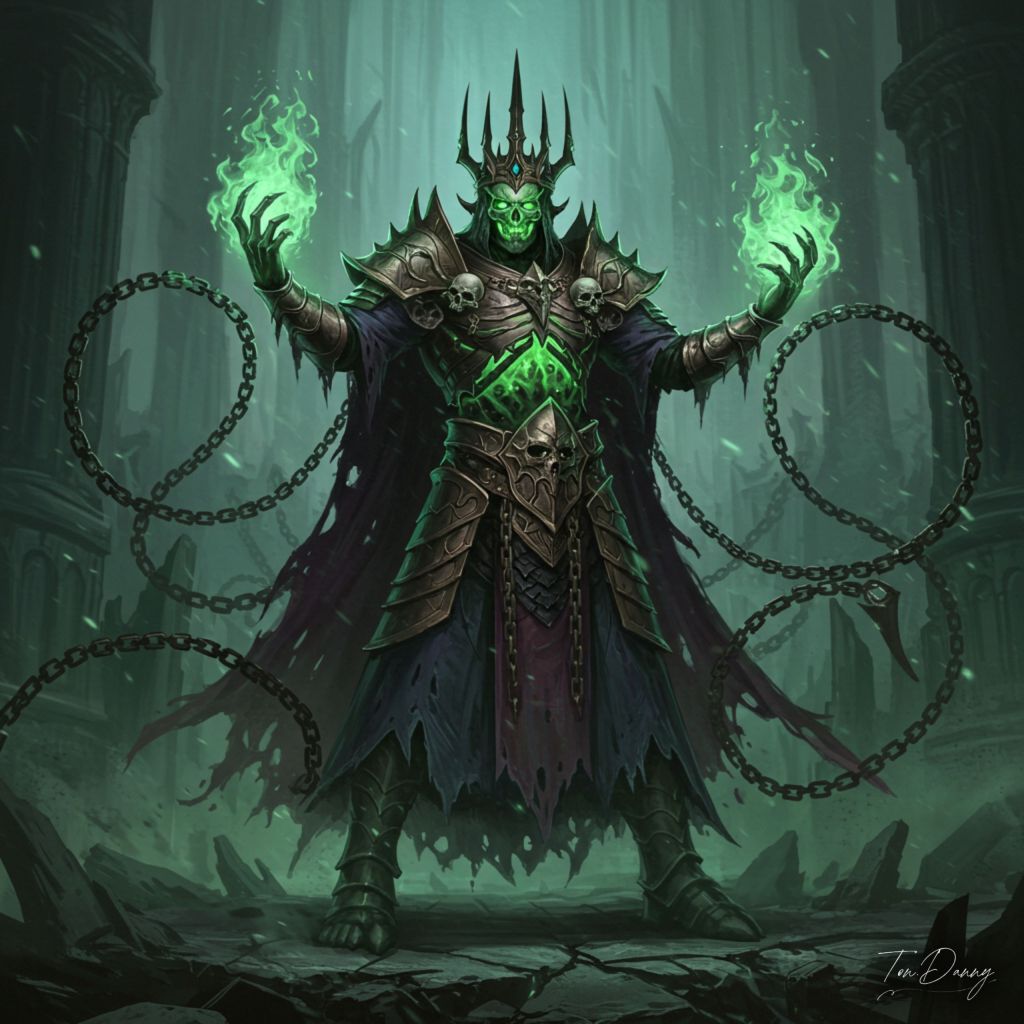 “Standing amidst the shattered remains of an ancient kingdom, the Underworld Chain Tyrant raises his clawed hands, summoning massive, writhing chains from the abyss beneath his feet. His towering skeletal form is clad in a tattered royal cloak, its fibers infused with the tormented wails of fallen kings. His hollow eye sockets flicker with green, malevolent fire, and his twisted crown, forged from the spines of fallen gods, hovers above his skull. The chains, each engraved with runes of torment, coil and lash through the air, dragging wailing spirits into the tyrant’s grasp. As he moves, the very ground beneath him fractures, revealing glimpses of the writhing souls trapped within the underworld.”