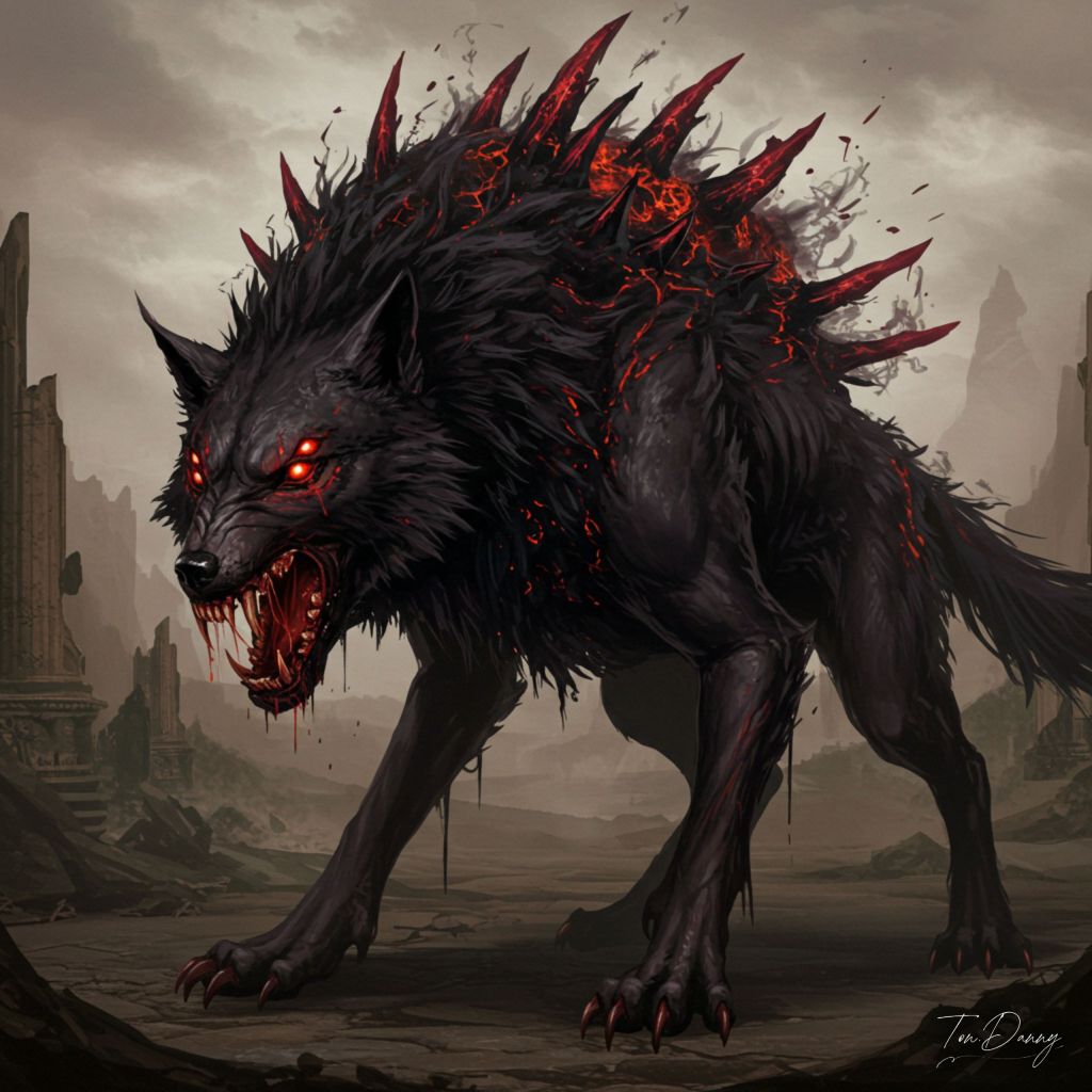 “A monstrous wolf, its body composed of living shadows and tendrils of abyssal mist, prowls through the ruins of a forgotten world. Its six crimson eyes glow like burning coals, scanning the land for prey. Jagged spines of dark obsidian protrude along its back, crackling with cursed energy. As it moves, the air itself quivers, its form shifting and distorting as if it exists between dimensions. Its elongated jaws open to reveal rows of glistening, interlocking fangs, dripping with an inky, corrosive substance that melts stone upon contact. The beast does not howl—its presence alone sends waves of pure dread rippling through the desolate landscape, announcing its silent hunt.”