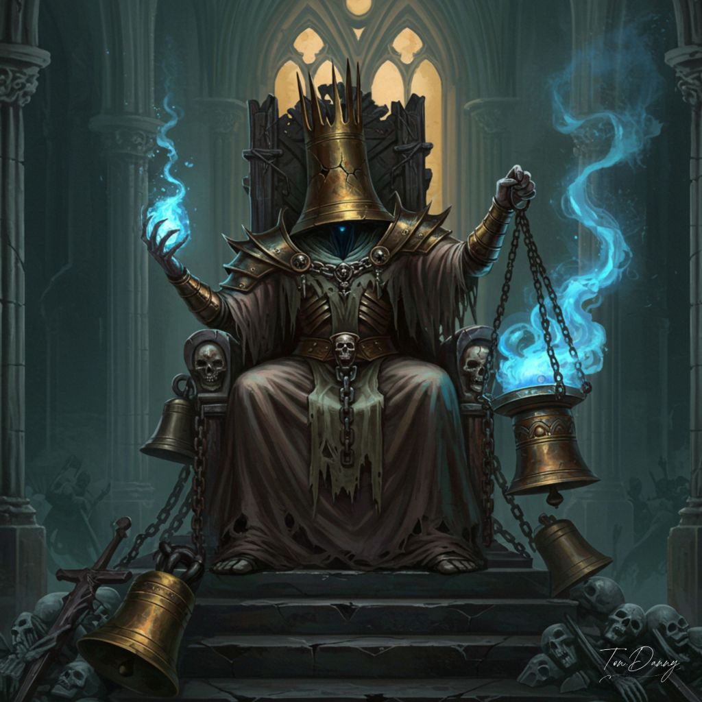“Seated upon a throne of rusted chains and shattered bells, the Cursed Bell King presides over a ruined cathedral, his skeletal form wrapped in layers of tattered robes that shift like smoke. His face, obscured by an ancient, cracked bell that hangs where a head should be, emits a hollow, echoing toll with every movement. In his clawed hand, he holds a great censer, wreathed in spectral blue flames, swinging slowly as cursed incense spills into the air, thick with the whispers of the condemned. Each breath drawn in its presence is a step closer to eternal damnation. The ruined cathedral, shrouded in perpetual twilight, is lined with the petrified remains of those who have heard his call—warriors, kings, and beggars alike, all frozen in silent reverence. They did not die in agony. They simply stopped moving, their bodies turned to lifeless stone, their souls trapped in the unending dirge of the Bell King’s requiem.”
