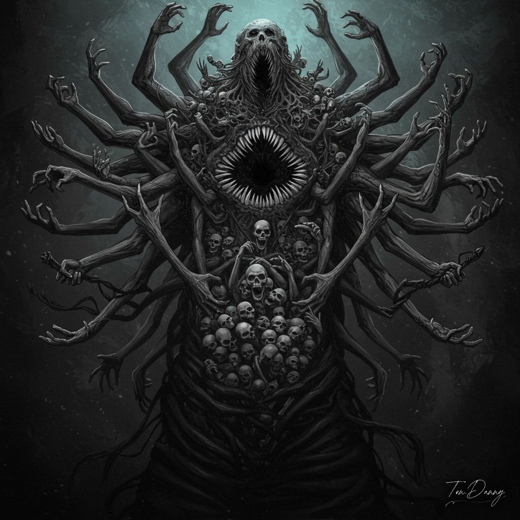 “At the edge of existence, where darkness bleeds into nothingness, a monstrous entity stirs. Its towering form is wrapped in a shifting mass of thousand writhing arms, each ending in grotesque, skeletal hands, some clutching ancient weapons, others stretching into the void as if searching for something unseen. Where a head should be, there is only a gaping, vertical maw, lined with spiraling rows of fanged teeth that exhale a constant, suffocating mist of blackened aether. Beneath its ever-moving limbs, the very fabric of reality distorts, cracking like fragile glass beneath its monstrous weight. With each step, the world quivers, unable to withstand the sheer magnitude of its presence. The voices of the forgotten call from its core, screaming in agony and ecstasy, their words incomprehensible, yet filled with an undeniable pull—an invitation to oblivion.”