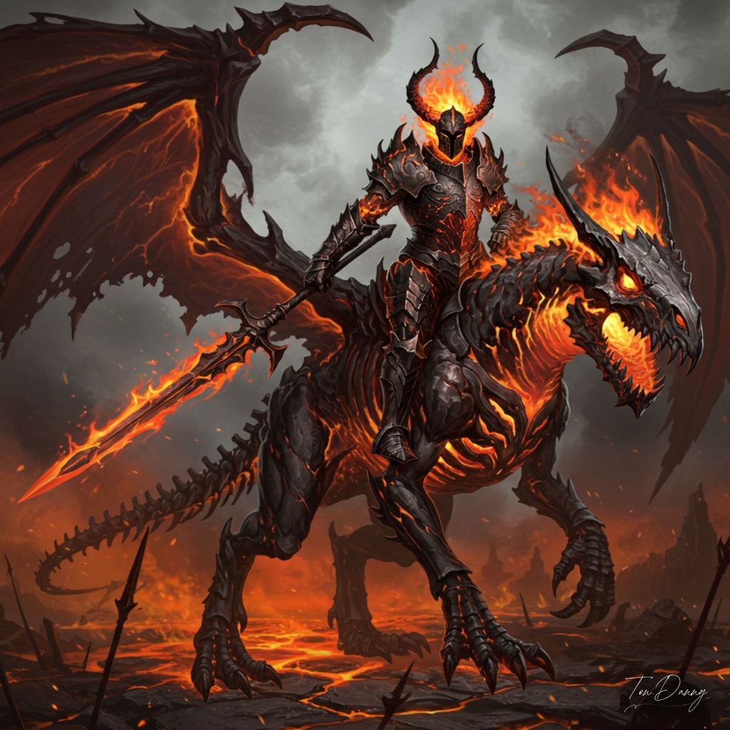 “Mounted upon a colossal dragon of blackened bone and hellfire, a spectral knight charges forth, its form wrapped in charred armor that smolders with unholy energy. The knight’s face is hidden beneath a helmet adorned with twisting, infernal horns, and through the slits, only a void of crimson fire can be seen. Its skeletal steed, once a mighty dragon, now exists only as a fiery specter, its hollow ribs flickering with cursed flames. The beast’s wings, torn and skeletal, leave trails of embers in their wake as they soar through the ash-choked sky. The knight wields a long, jagged lance, its tip crackling with aetherial flame, capable of piercing both flesh and soul alike. With each charge, the knight and its mount become a single, unstoppable force of destruction, a fiery omen of the apocalypse, burning a path through the battlefield as the ground crumbles into molten ruin beneath them.”