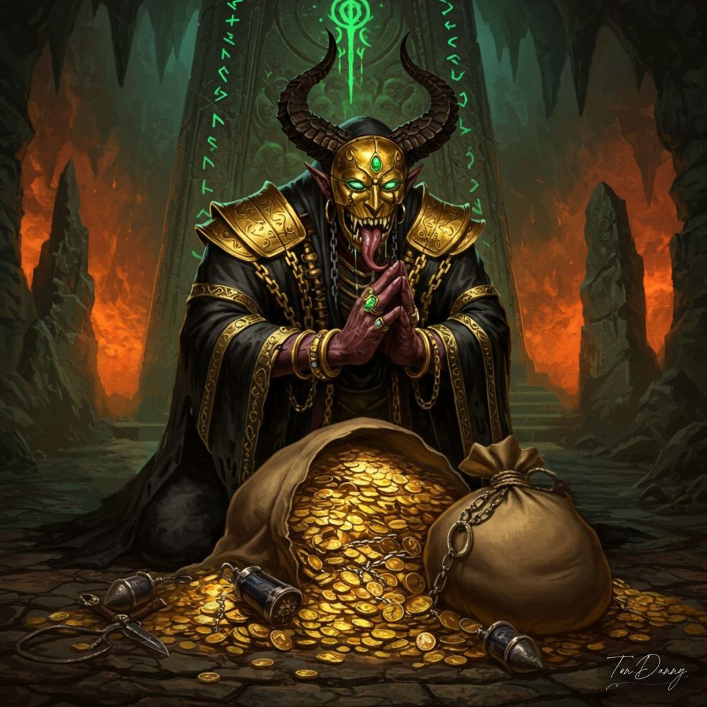 “Oil painting, Soul-like Eastern style, Dark fantasy atmosphere in a vast, infernal cavern. A sinister demon, draped in tattered black robes lined with gaudy gold embroidery, presses its clawed hands together, groveling with an obsequious, exaggerated grin. Its jagged, oversized horned mask, once fearsome, is now plated in gaudy, polished gold, reflecting the eerie glow of bubbling green fire. The glowing emerald eyes beneath the mask flicker with desperate cunning, darting between reverence and hidden malice. Before it, a large cloth bundle lies open on the cavern floor, overflowing with a mountain of gold coins, their polished surfaces gleaming in the infernal light. Some spill onto the ground, forming scattered piles of wealth, an offering too tempting to resist. The demon’s skeletal fingers, adorned with thick, jewel-encrusted rings, tremble with exaggerated humility. Its forked tongue flicks between jagged teeth, its grotesque grin stretching unnaturally as it drools over the treasure. Thick gold chains drape from its shoulders, clinking as it bows low, feigning submission, yet its coiling tail flicks impatiently, betraying its greed. Behind it, a towering stone altar inscribed with glowing runes casts flickering shadows on the cavern’s grotesque demonic carvings. Sinister whispers echo through the chamber, mocking its display. Though it grovels before the pile of riches, its clawed hands twitch, revealing that beneath the layers of ostentatious gold and fake humility, it is always scheming—waiting for the perfect moment to take everything for itself.”