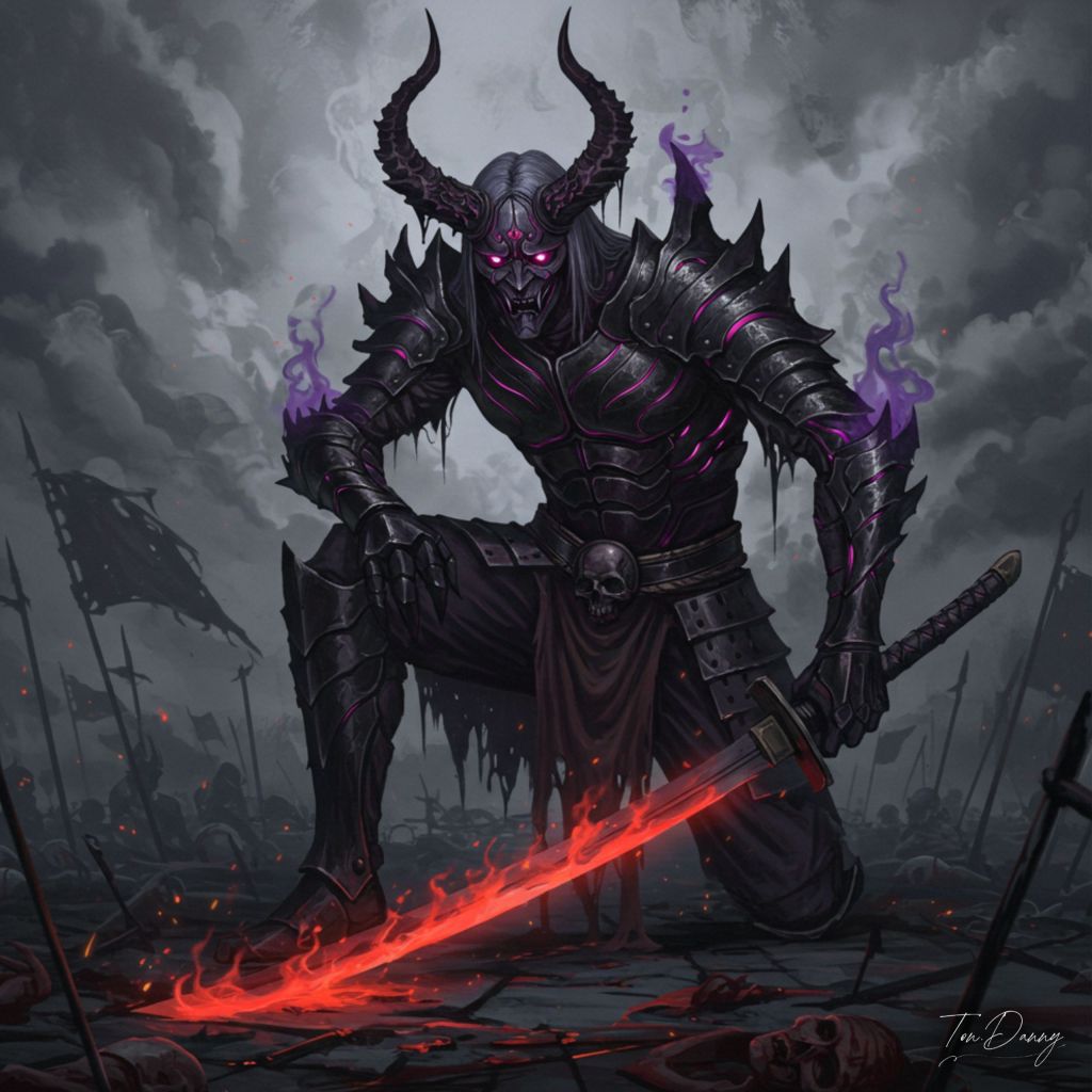 “A lone warrior kneels amidst a battlefield swallowed by darkness, his body wrapped in jagged, overlapping plates of obsidian armor that pulse with eerie violet veins. His elongated, demonic horns curve backward like scythes, dripping with liquid shadow that dissipates into the air. His face, hidden beneath a broken, oni-shaped mask, reveals only a single, glowing eye—an infernal ember that watches with endless hunger. In his clawed hands, he grips a shadow-forged katana, its blade wreathed in cursed flames that consume light itself. With each movement, his form flickers like a phantom, his presence blurring between dimensions. The air around him hums with the whispering voices of those he has slain, their spirits bound eternally to his blade. His stance is low and predatory, his every motion like that of a beast moments before the kill. As he moves, the ground beneath him withers into blackened ash, leaving a trail of smoldering footprints. He is neither living nor dead—he is the executioner of the abyss, a wraith who feeds on battle, an eternal shadow that cannot be slain.”