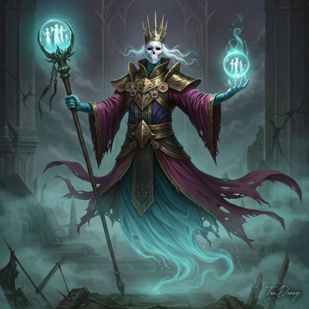 “Atop the crumbling remains of a once-great palace, a spectral monarch drifts weightlessly, his form wreathed in swirling mist and broken memories. His tattered, regal robes billow unnaturally, flowing as if submerged in unseen tides. His face, obscured beneath an elaborate, expressionless porcelain mask, reveals no trace of humanity—only an empty void where his soul once resided. In one translucent hand, he clutches a staff crowned with a shattered crystal orb, within which faint, whispering figures can be seen flickering like dying stars. With every slow movement, the mist around him thickens, weaving illusions of a forgotten empire—towers still standing, banners still waving, citizens still kneeling in eternal fealty. Yet, these are but echoes of the past, vanishing into nothingness as quickly as they appear. For the Phantom King is neither ruler nor conqueror—he is a relic of a world that no longer exists, a nightmare clinging desperately to the fabric of reality.”